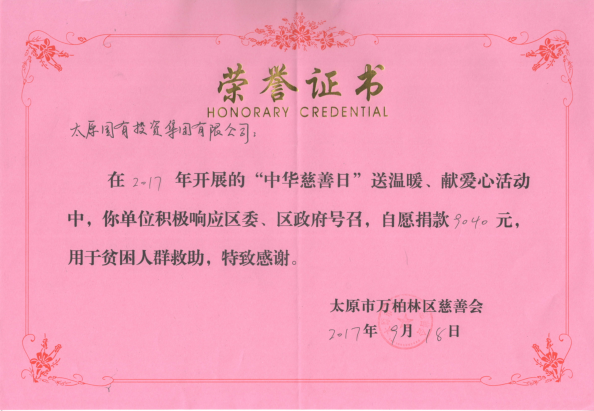 樂善好施、扶貧幫困是中華民族的傳統美德;奉獻社會、傳遞愛心是社會倡導的時代新風。為培育和弘揚社會主義核心價值觀,廣泛動員員工參與慈善、奉獻愛心,形成團結互助、扶貧濟困的良好風尚,積極參與公民道德宣傳日活動。9月14日,太原國投集團組織開展了“中華慈善日”送溫暖、獻愛心捐款活動,共募集善款9040元整。