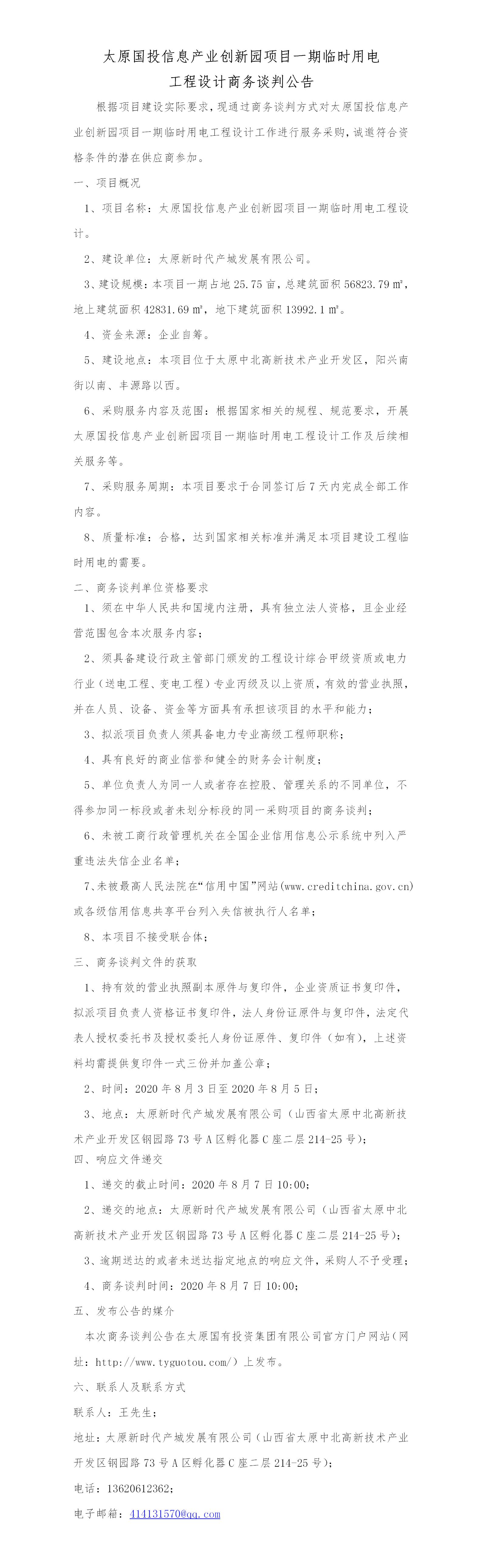 太原國投信息產業創新園項目一期臨時用電工程設計商務談判公告