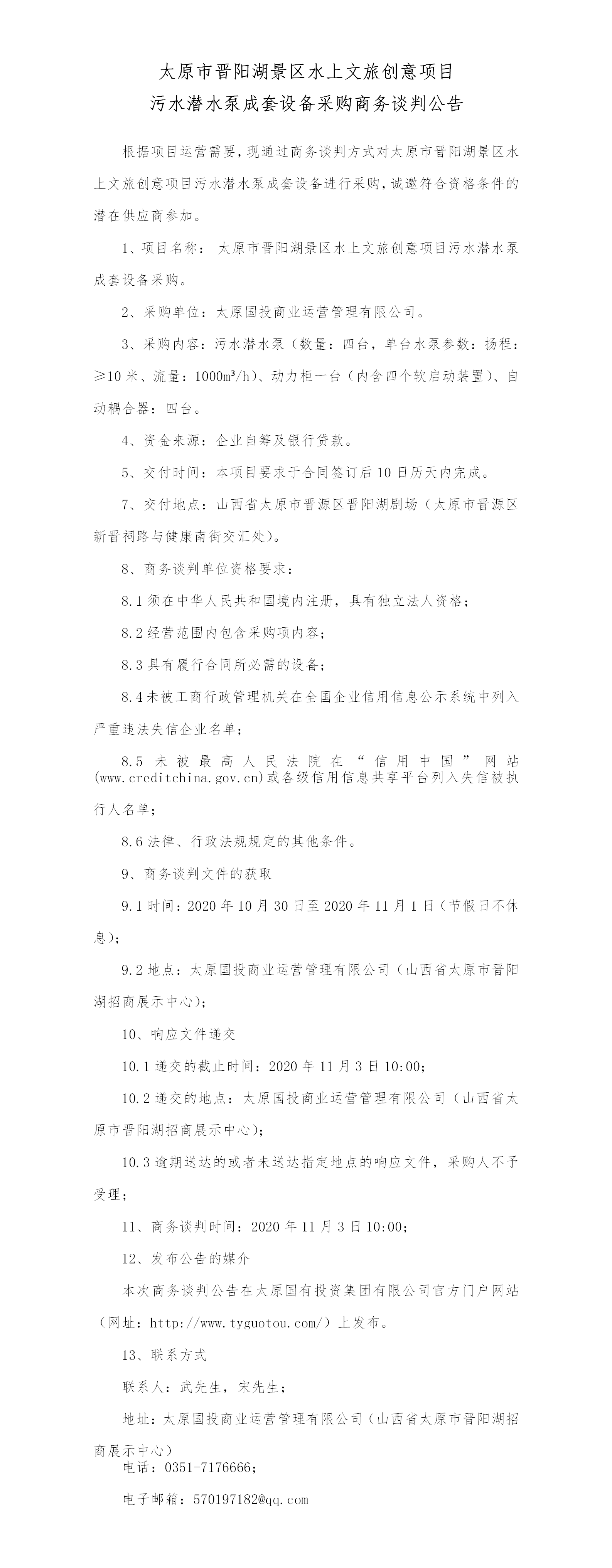 太原市晉陽湖景區水上文旅創意項目污水潛水泵成套設備采購商務談判公告