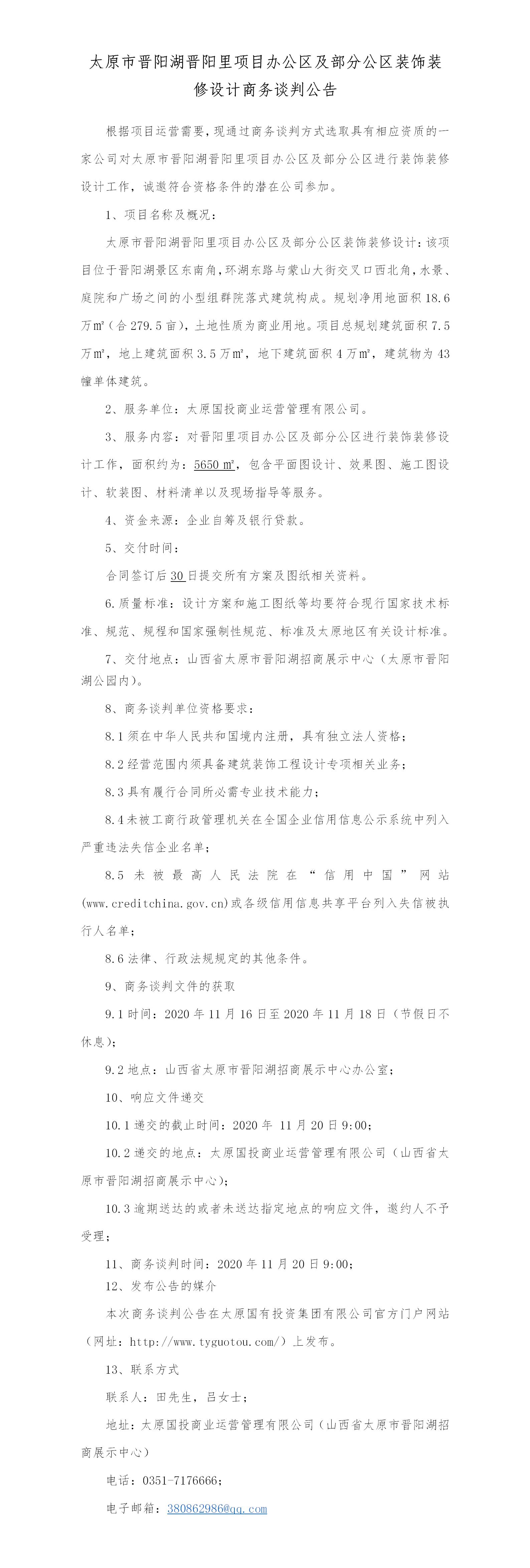 太原市晉陽(yáng)湖晉陽(yáng)里項(xiàng)目辦公區(qū)及部分公區(qū)裝飾裝修設(shè)計(jì)商務(wù)談判公告
