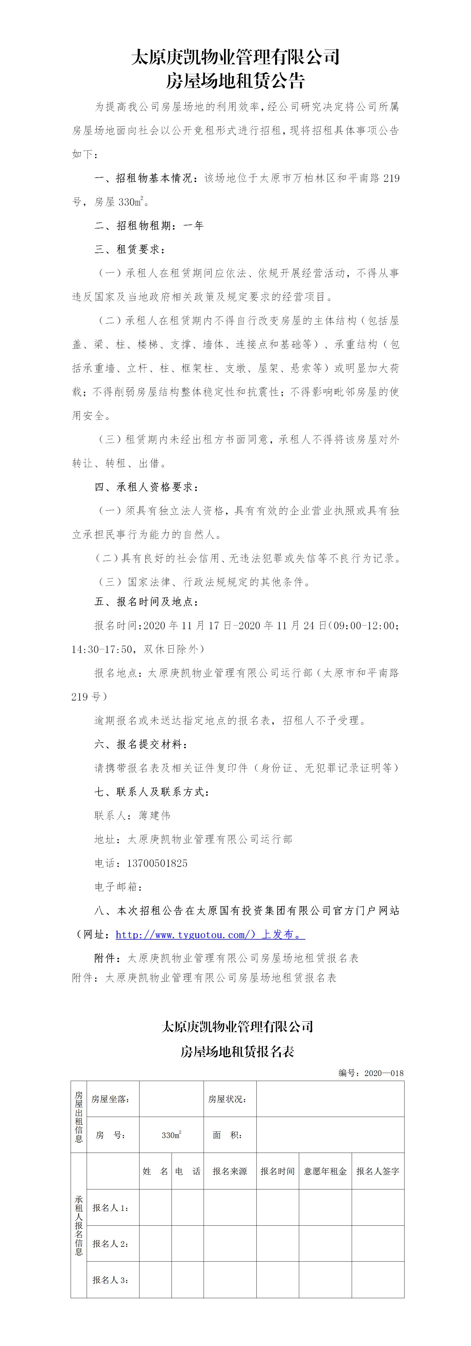 太原庚凱物業(yè)管理有限公司房屋場(chǎng)地租賃公告(十八)