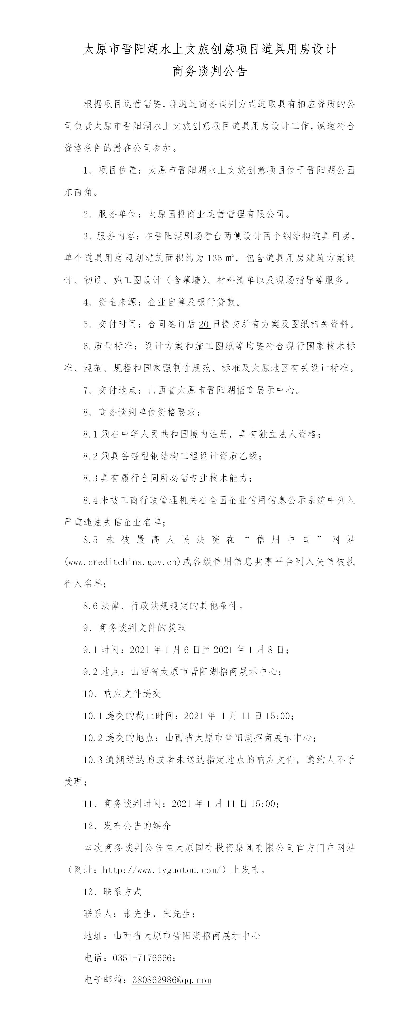 太原市晉陽湖水上文旅創意項目道具用房設計商務談判公告