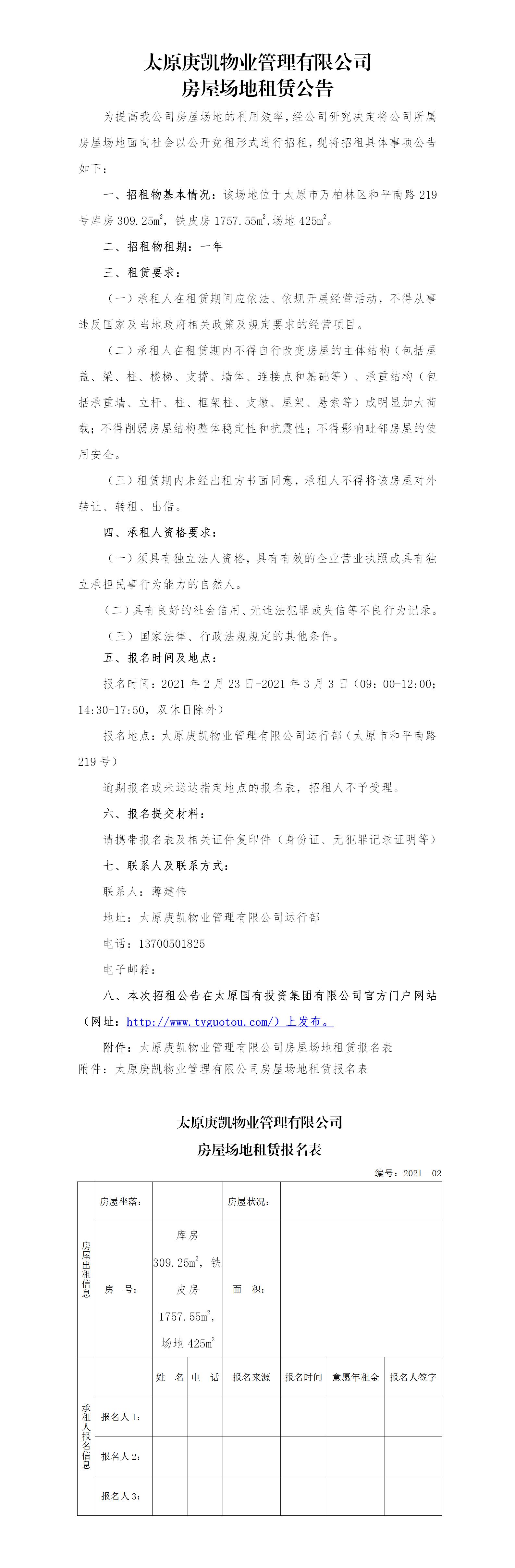 太原庚凱物業管理有限公司房屋場地租賃公告(二十三)