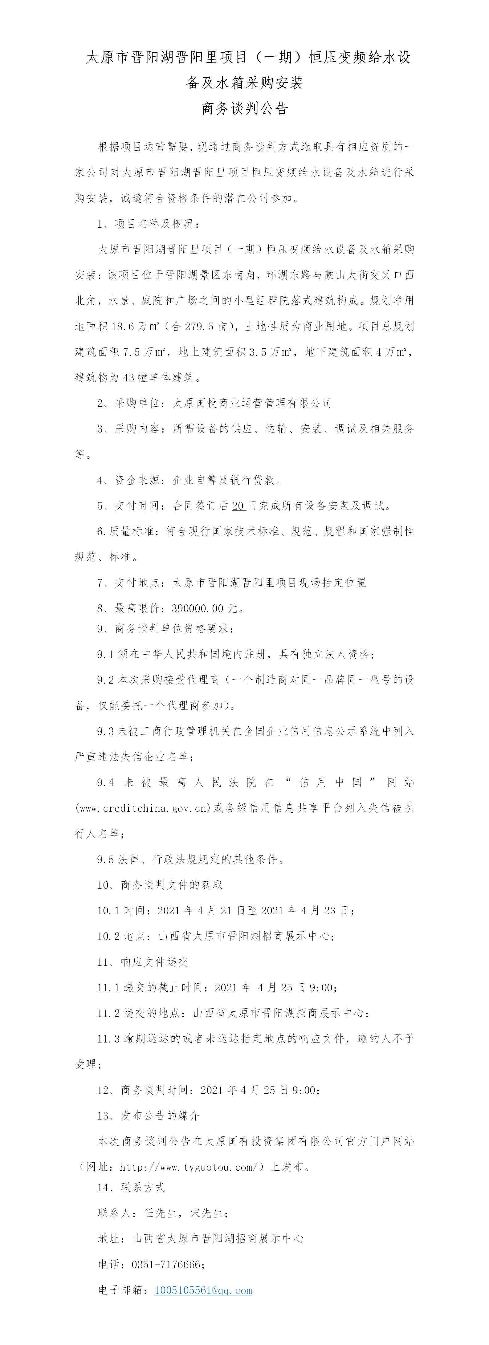 太原市晉陽湖晉陽里項(xiàng)目(一期)恒壓變頻給水設(shè)備及水箱采購(gòu)安裝商務(wù)談判公告