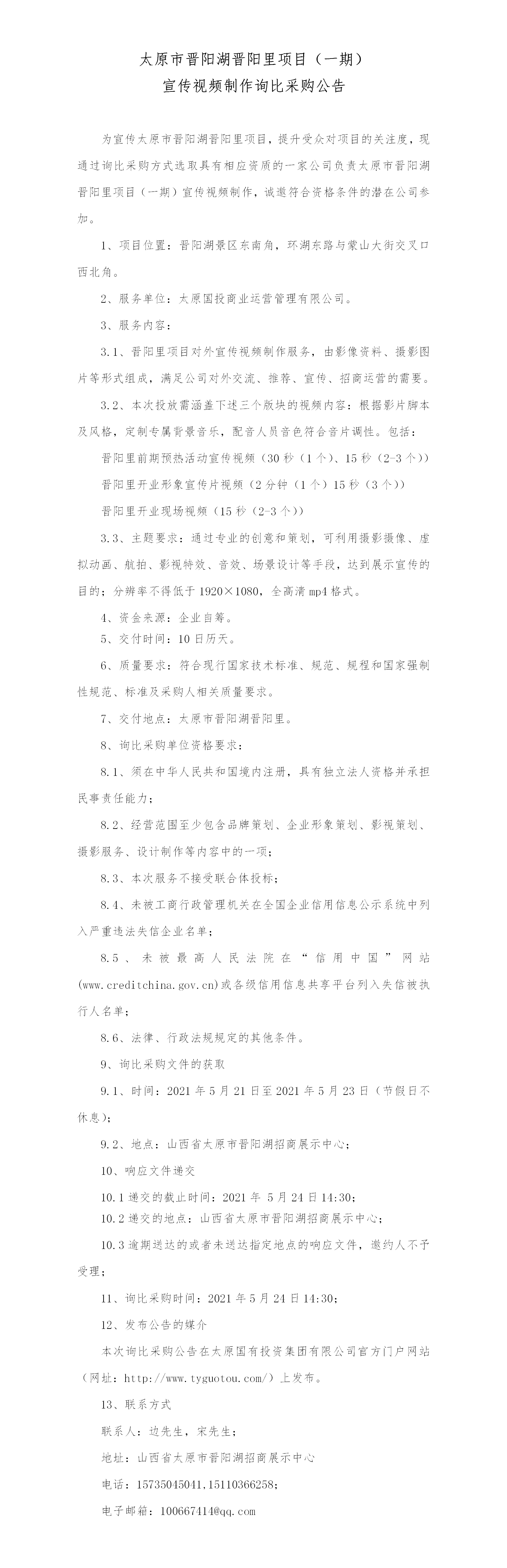 太原市晉陽湖晉陽里項目(一期)宣傳視頻制作公告
