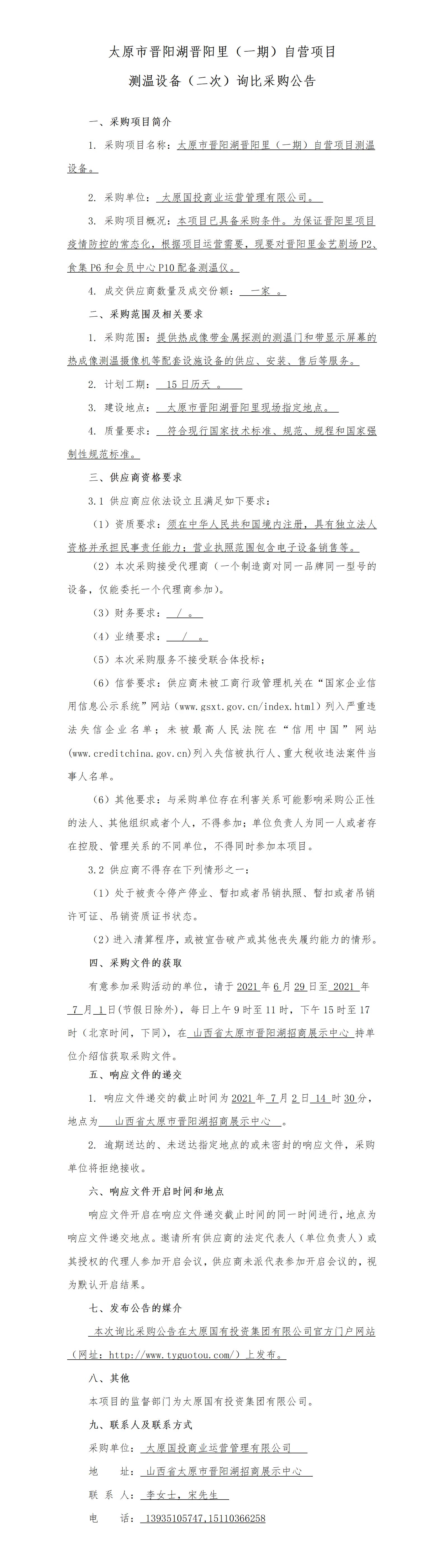 太原市晉陽湖晉陽里(一期)自營項目測溫設(shè)備詢比采購公告(二次)