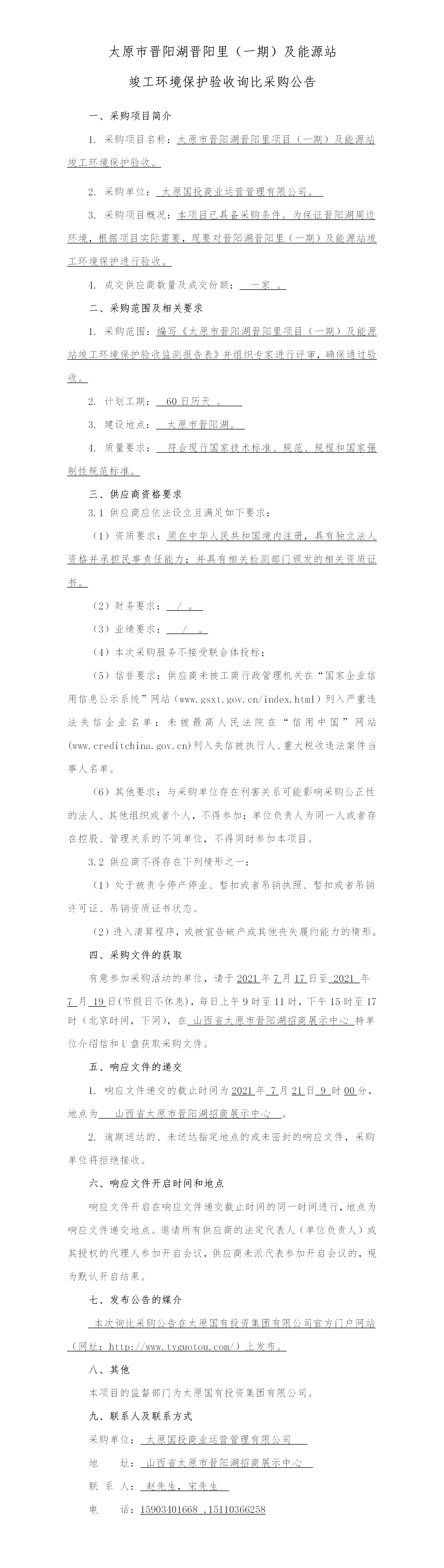太原市晉陽湖晉陽里(一期)及能源站竣工環境保護驗收詢比采購公告