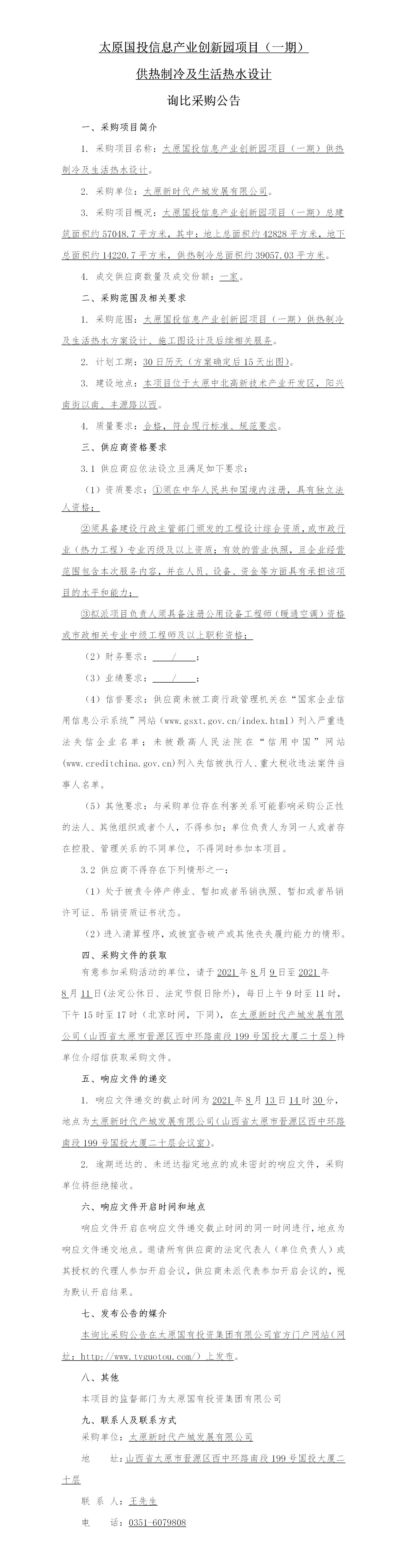 太原國投信息產業創新園項目(一期)供熱制冷及生活熱水設計詢比采購公告