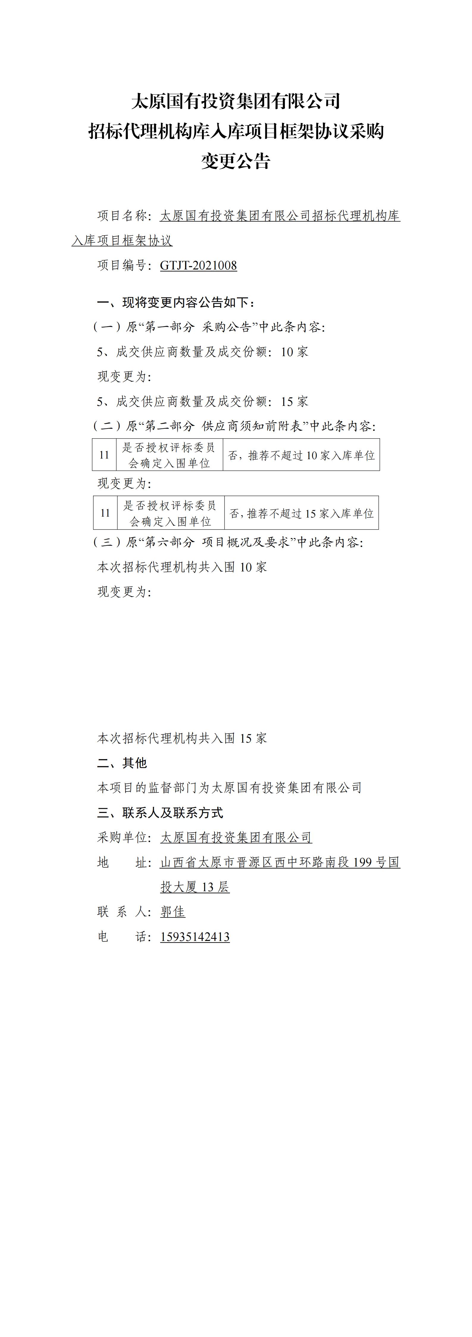 太原國有投資集團有限公司招標代理機構庫入庫項目框架協議采購變更公告