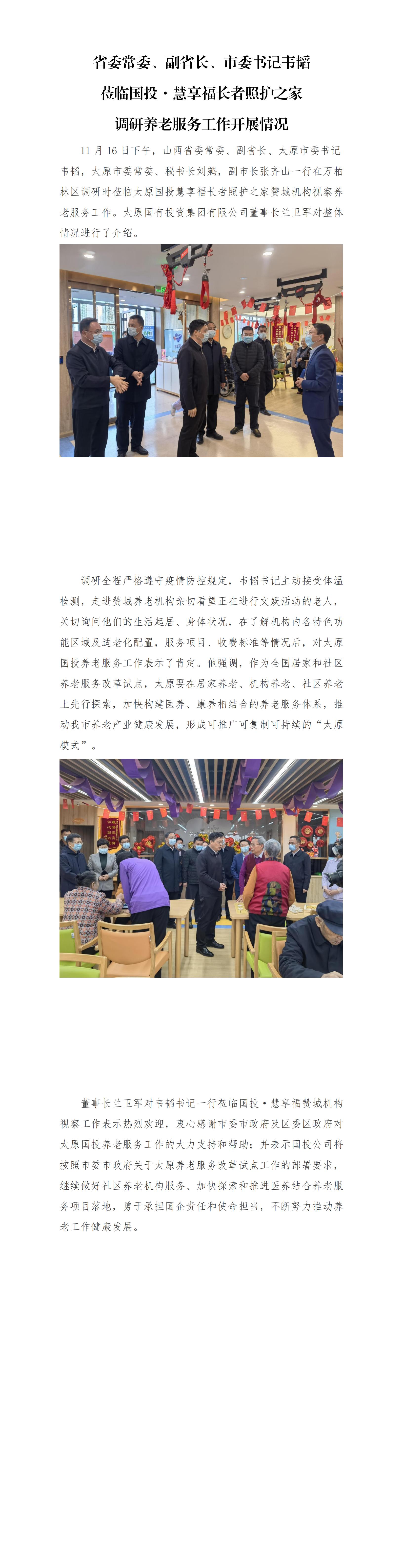 省委常委、副省長、市委書記韋韜蒞臨國投·慧享福長者照護之家調研養老服務工作開展情況