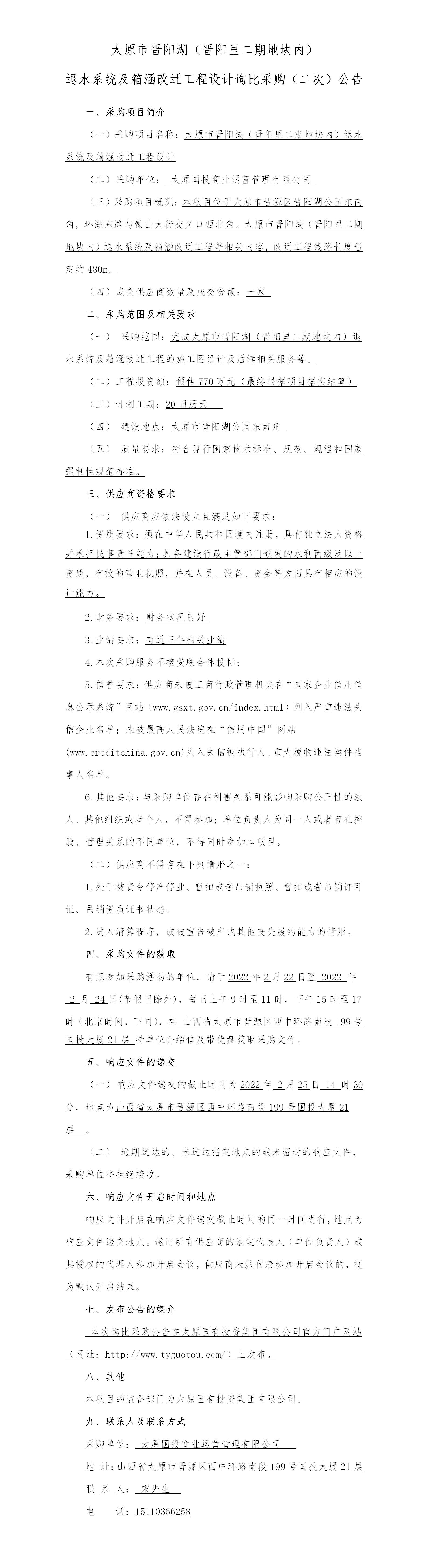 太原市晉陽湖(晉陽里二期地塊內(nèi))退水系統(tǒng)及箱涵改遷工程設(shè)計(jì)詢比采購(二次)公告