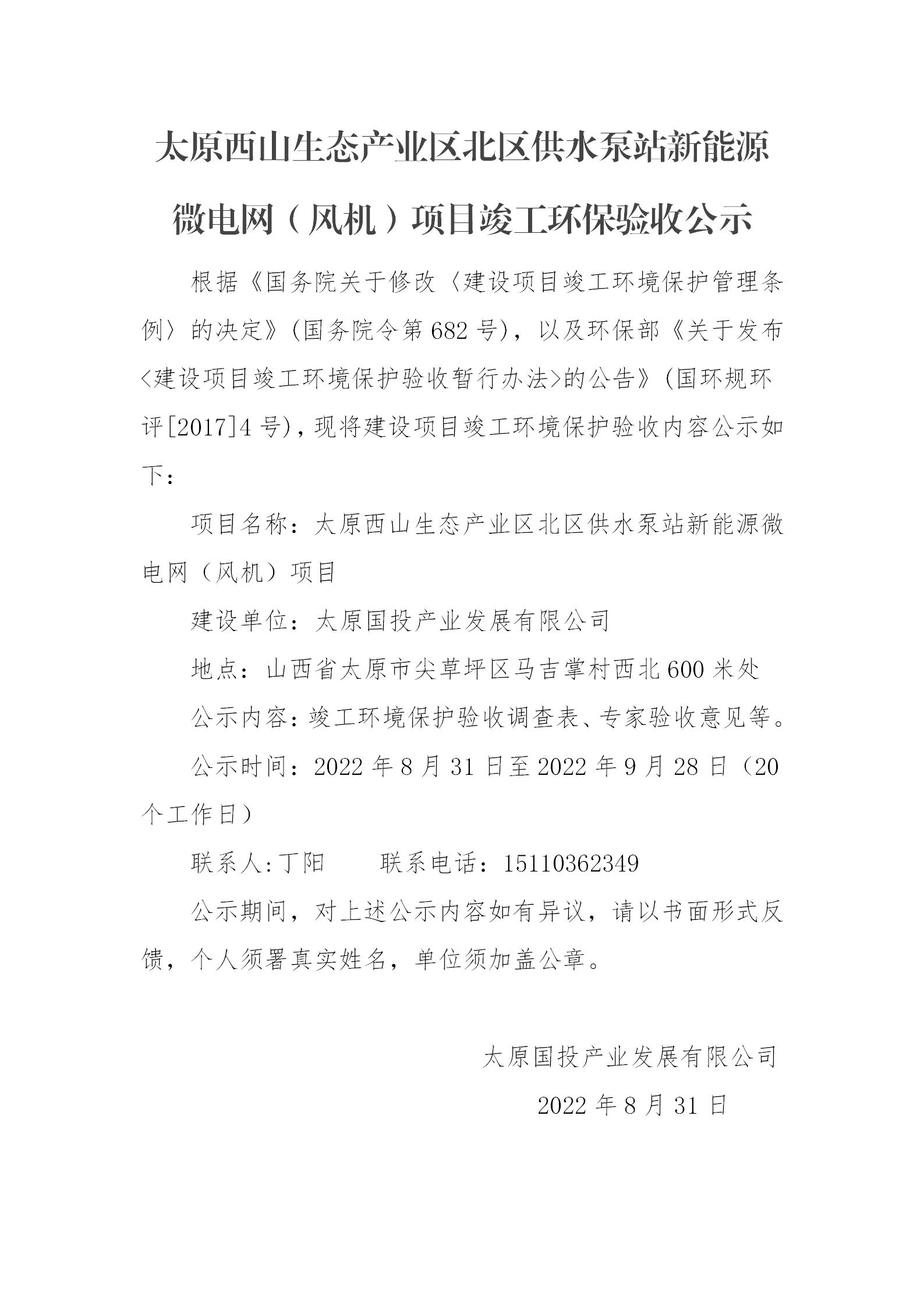 太原西山生態產業區北區供水泵站新能源微電網(風機)項目竣工環保驗收公示