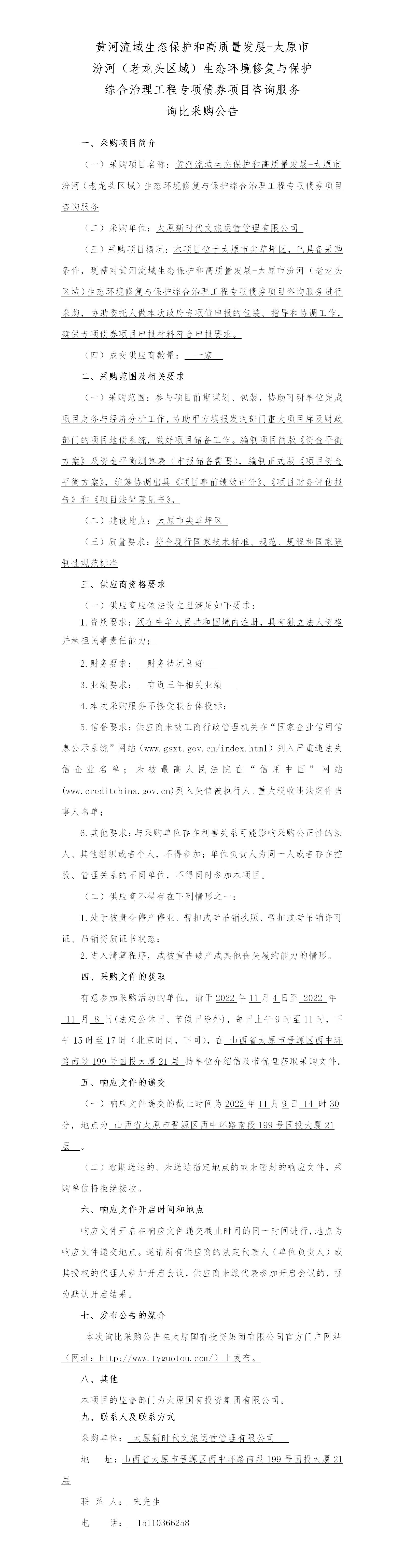 黃河流域生態保護和高質量發展-太原市汾河(老龍頭區域)生態環境修復與保護綜合治理工程專項債券項目咨詢服務詢比采購公告