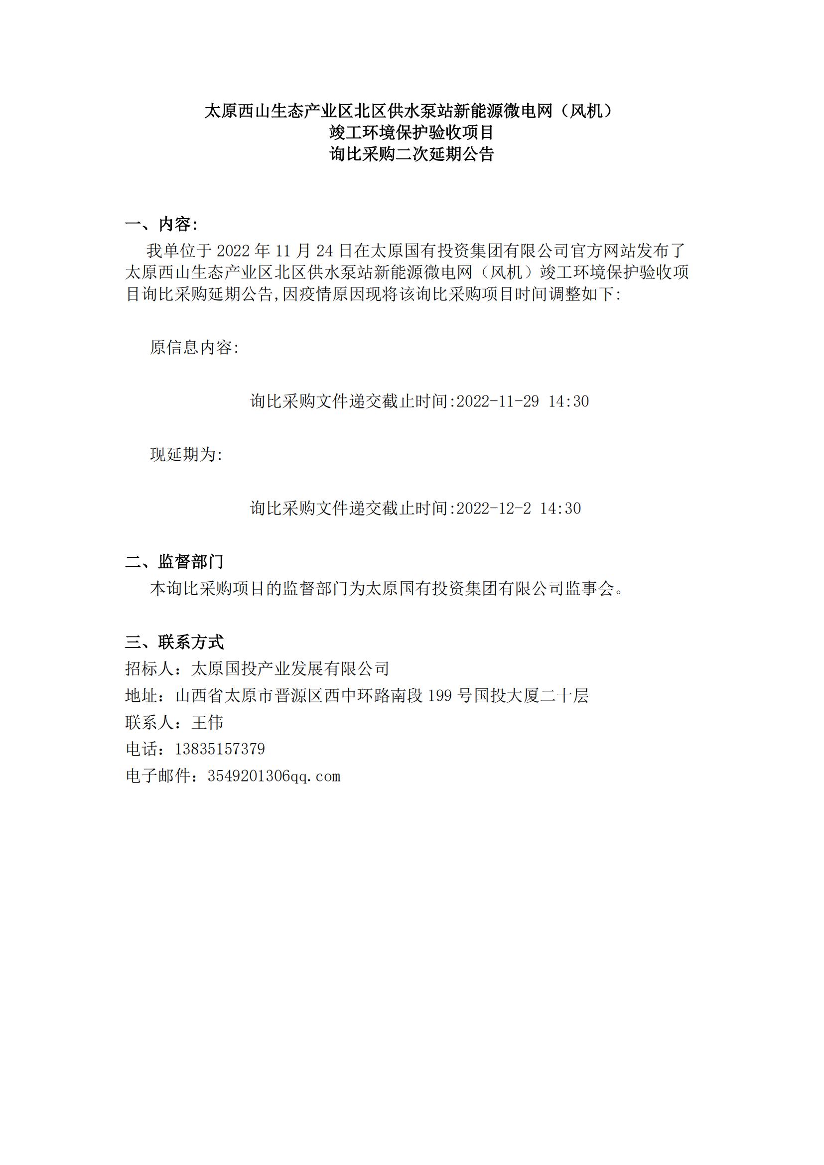 太原西山生態產業區北區供水泵站新能源微電網風機竣工環境保護驗收項目詢比采購二次延期公告