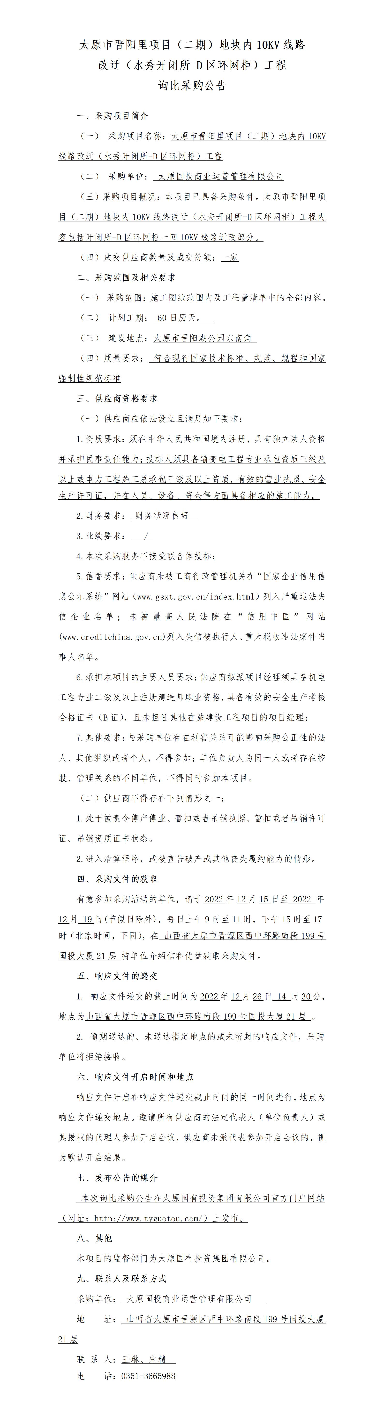 太原市晉陽里項目(二期)地塊內10KV線路改遷(水秀開閉所-D區環網柜)工程詢比采購公告