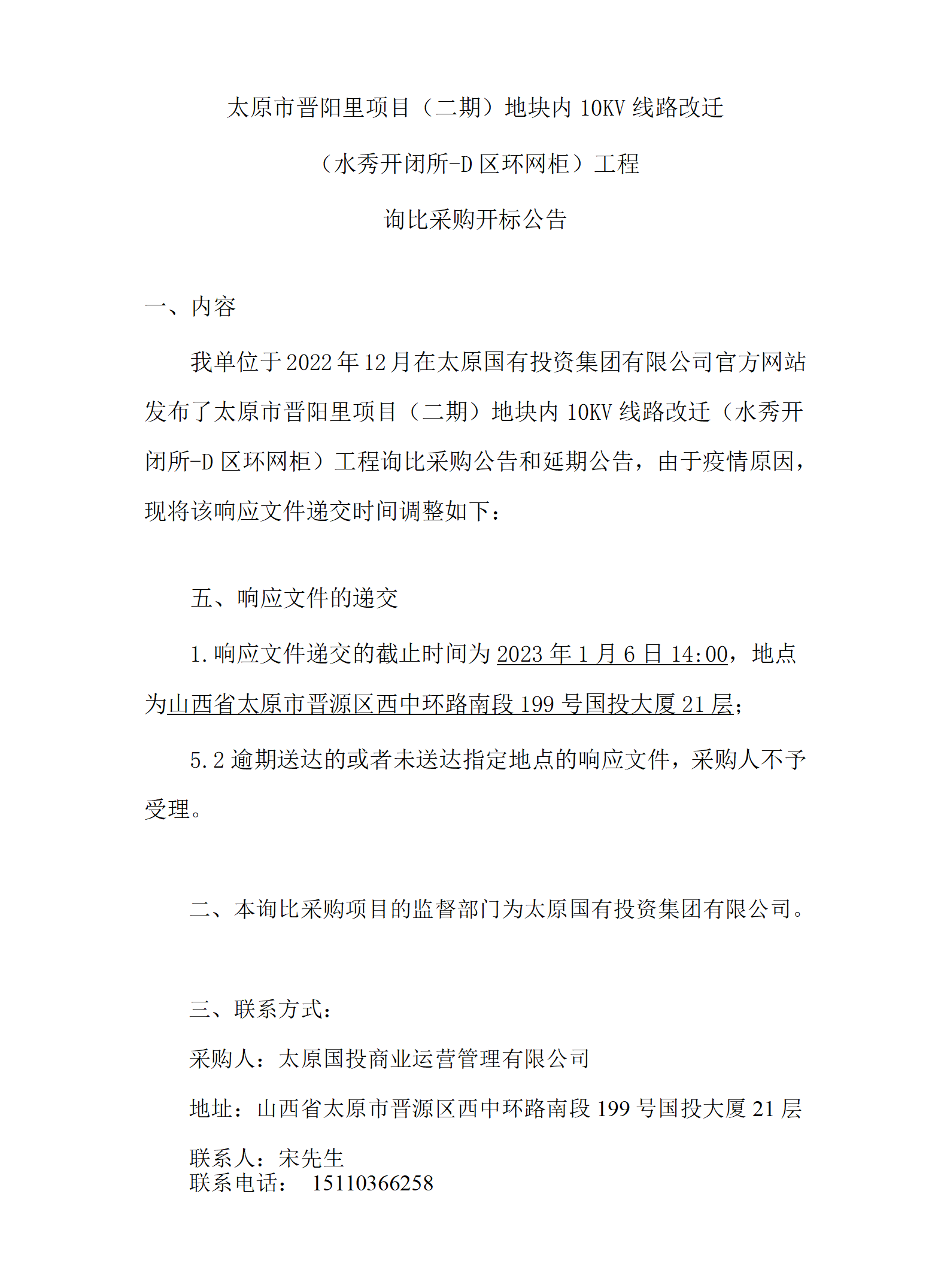 太原市晉陽里項目(二期)地塊內10KV線路改遷(水秀開閉所-D區環網柜)工程詢比采購開標公告