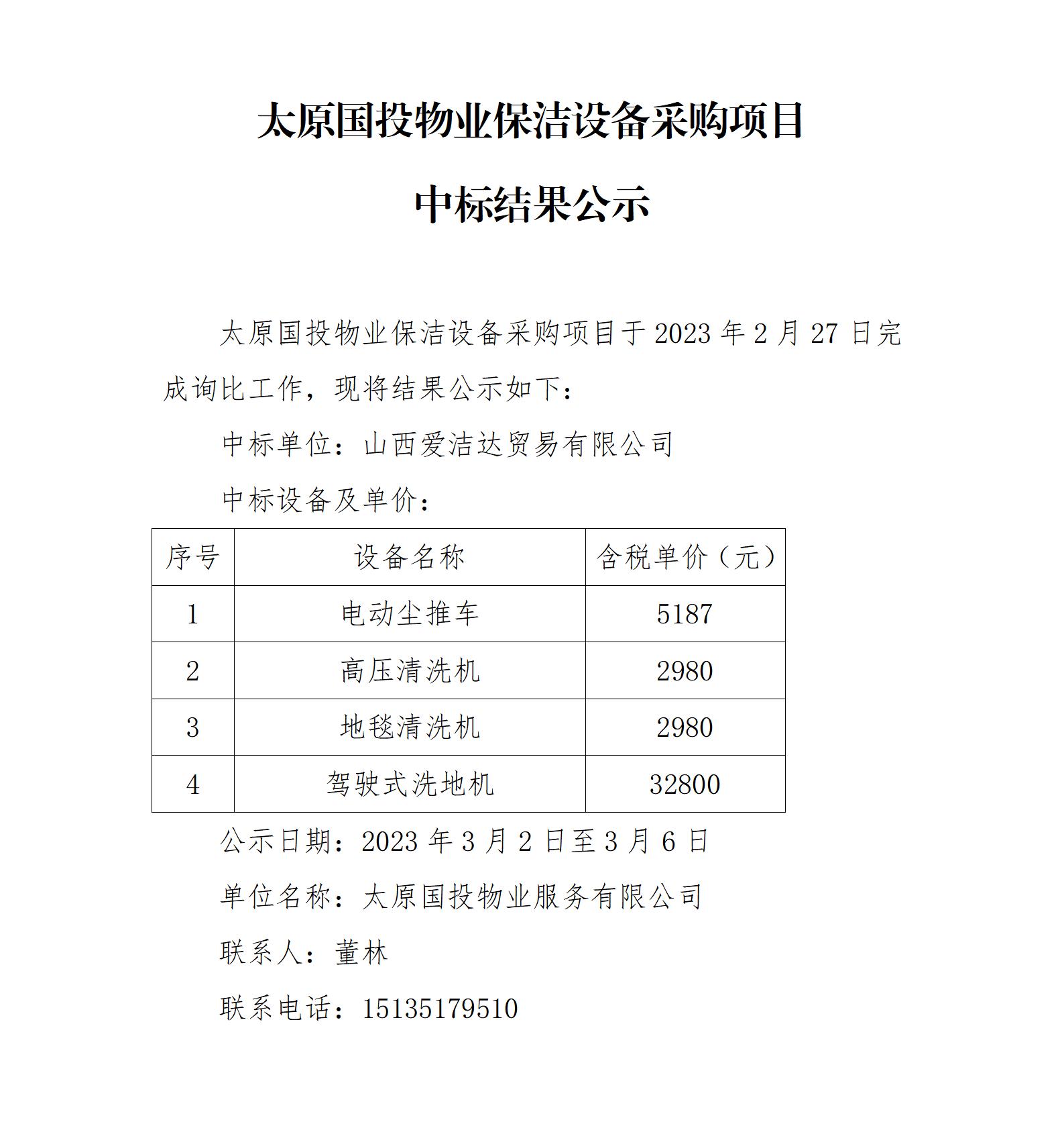 太原國(guó)投物業(yè)保潔設(shè)備采購項(xiàng)目中標(biāo)結(jié)果公示