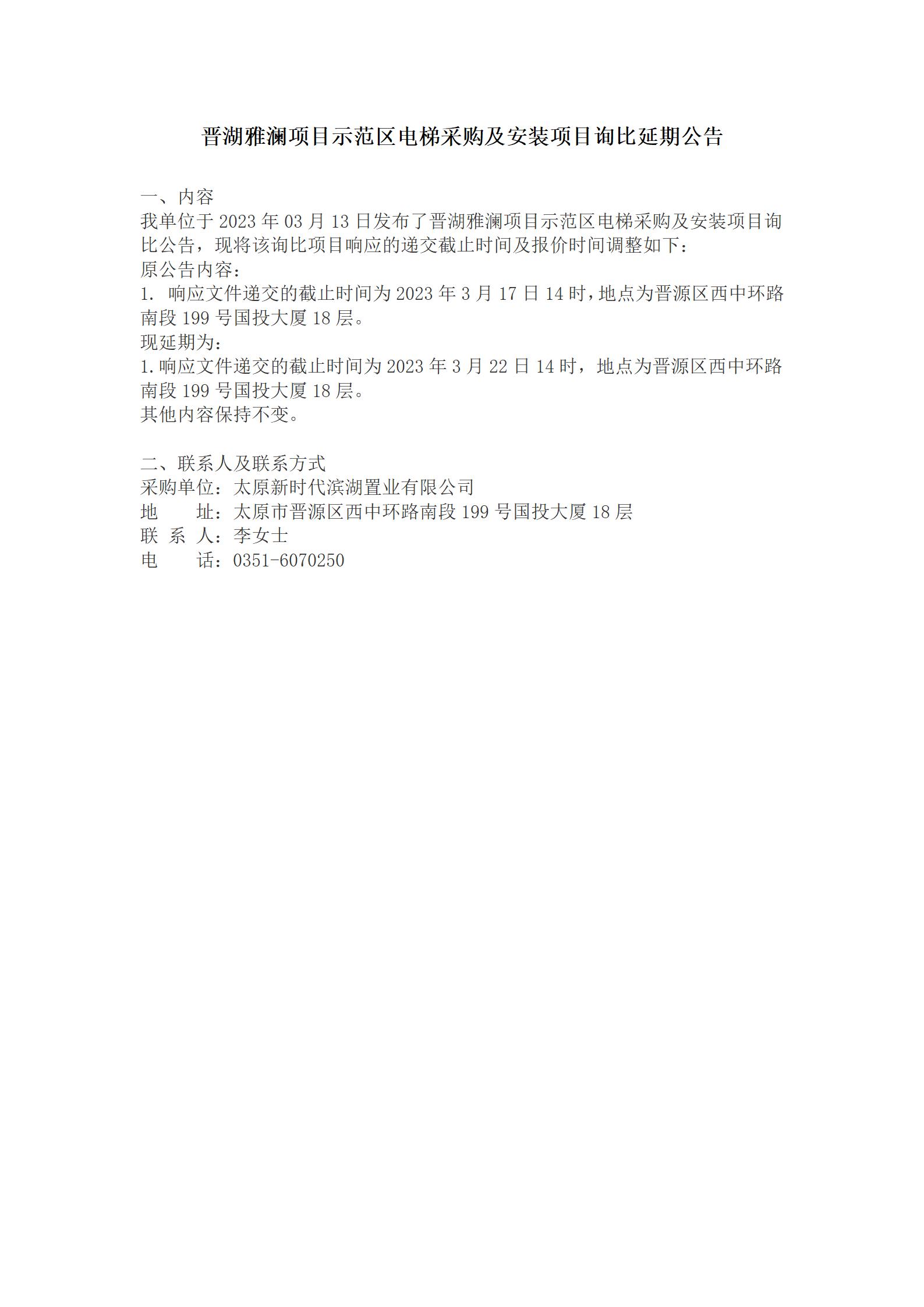 晉湖雅瀾項目示范區電梯采購及安裝項目詢比延期公告