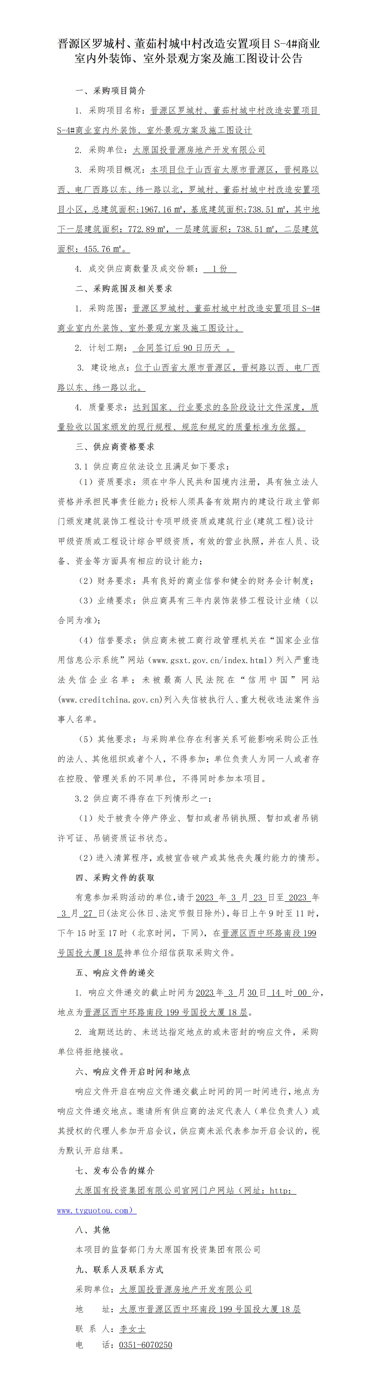 晉源區羅城村、董茹村城中村改造安置項目S-4#商業室內外裝飾、室外景觀方案及施工圖設計公告