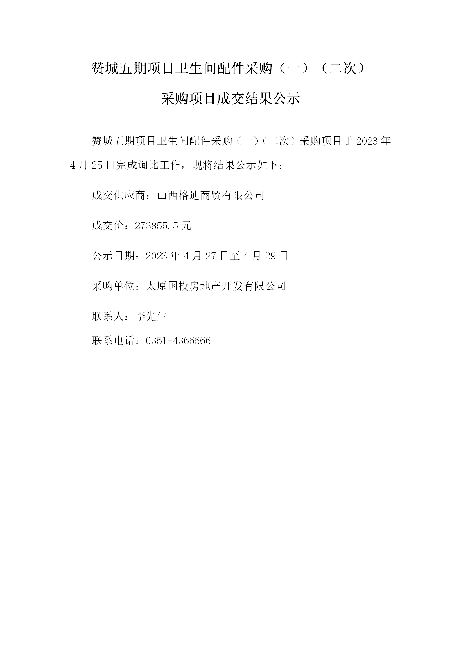 贊城五期項目衛生間配件采購(一)(二次)采購項目成交結果公示