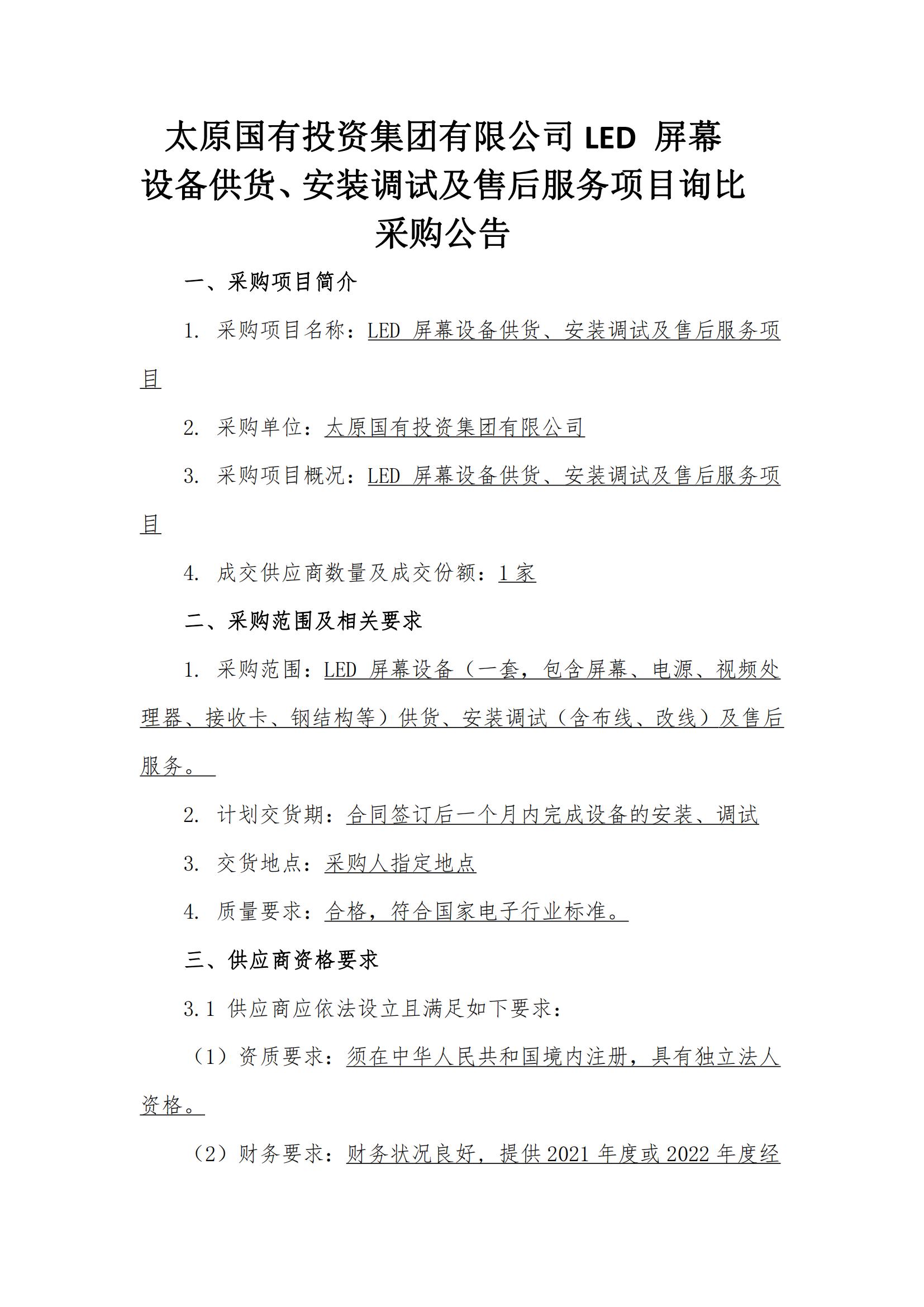 太原國有投資集團有限公司LED 屏幕 設備供貨、安裝調試及售后服務項目詢比采購公告