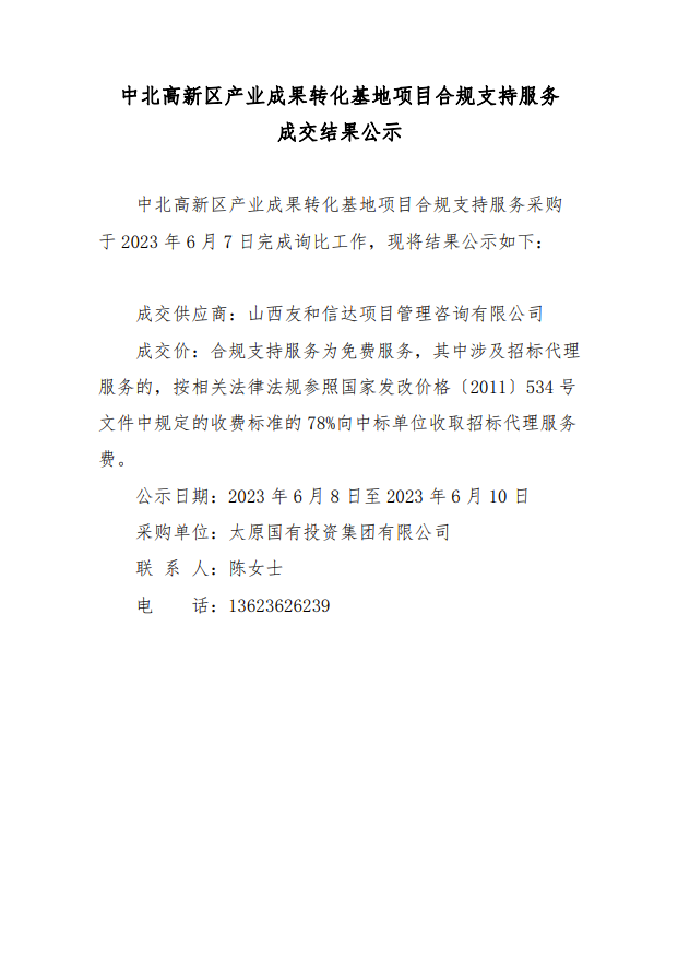 中北高新區產業成果轉化基地項目合規支持服務成交結果公示