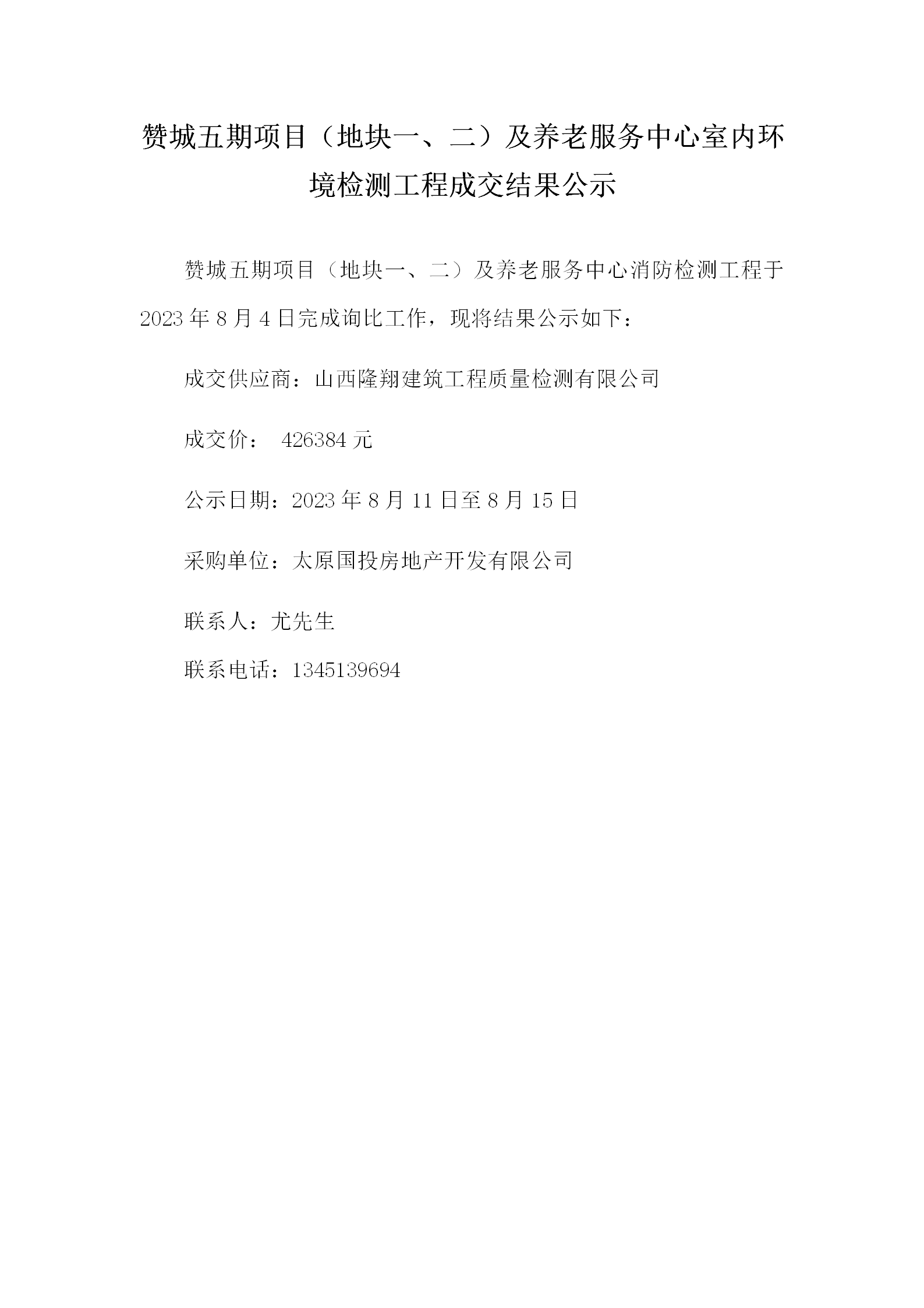 贊城五期項目(地塊一、二)及養老服務中心室內環境檢測工程成交結果公示