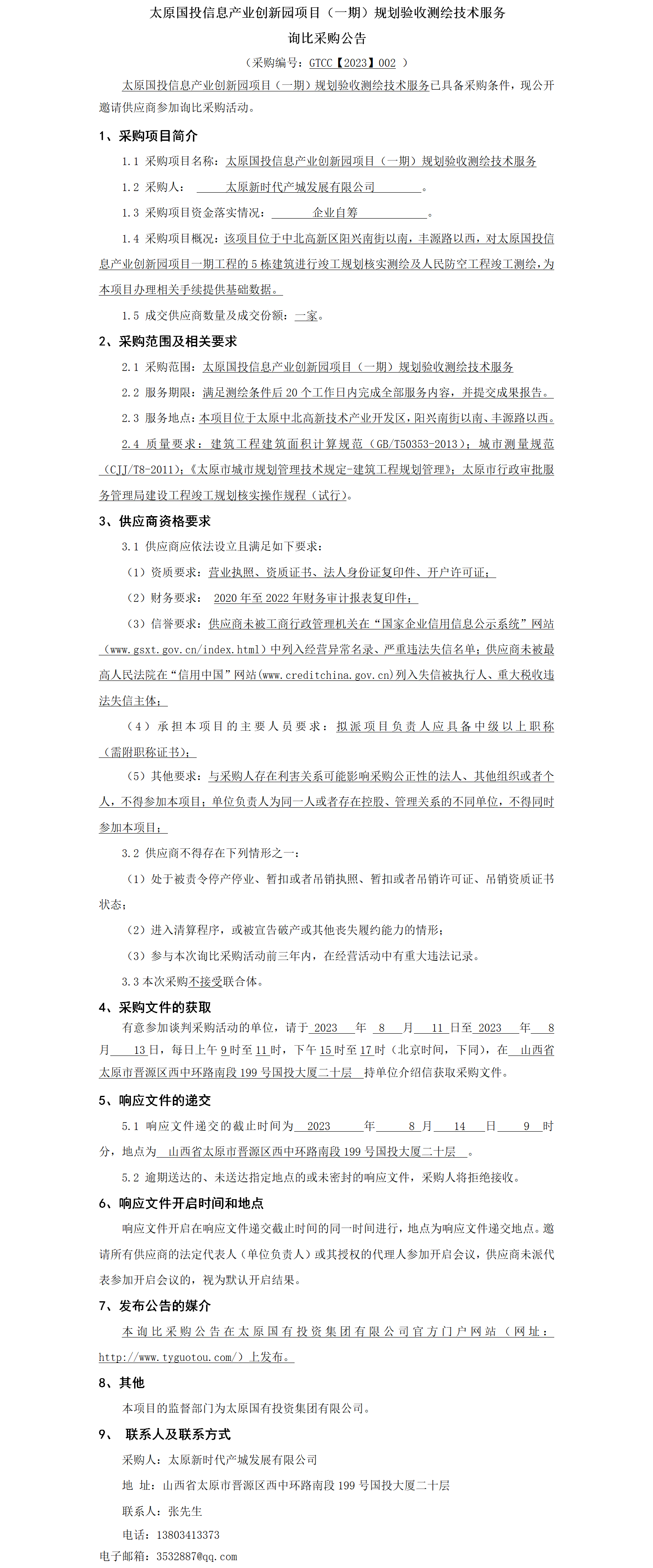 太原國投信息產業創新園項目(一期)規劃驗收測繪技術服務 詢比采購公告