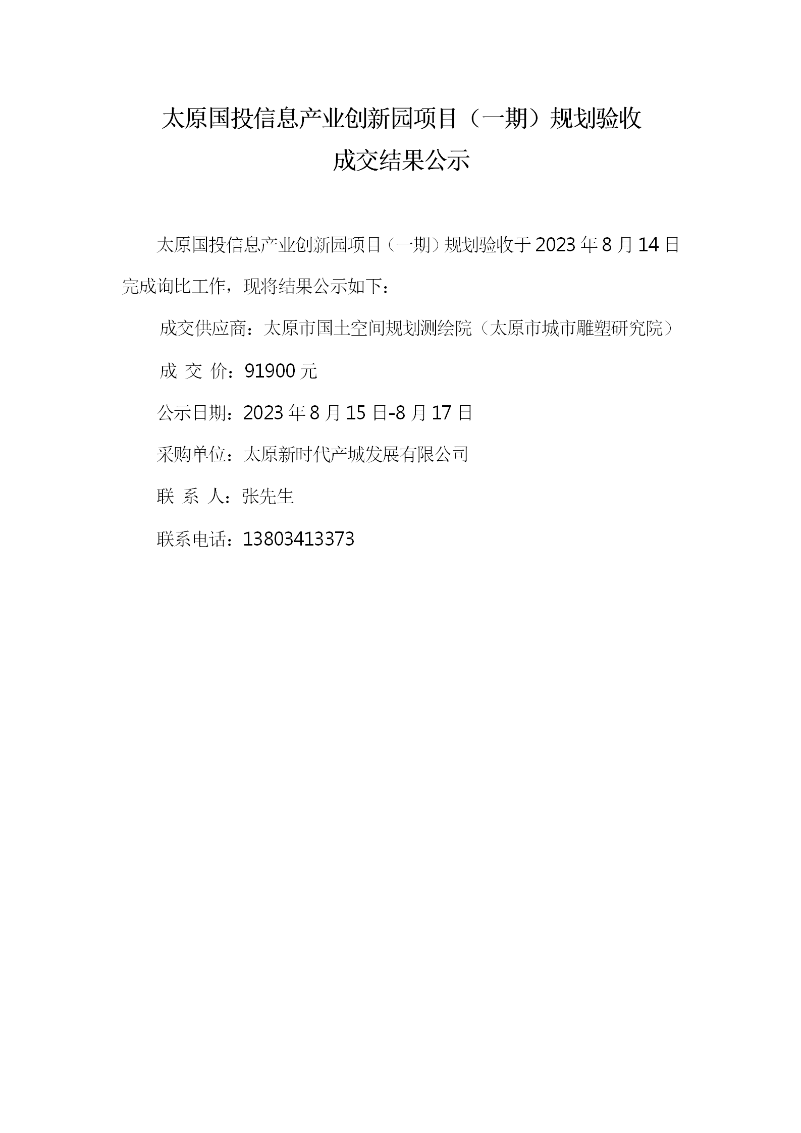 太原國投信息產(chǎn)業(yè)創(chuàng)新園項目(一期)規(guī)劃驗收 成交結(jié)果公示