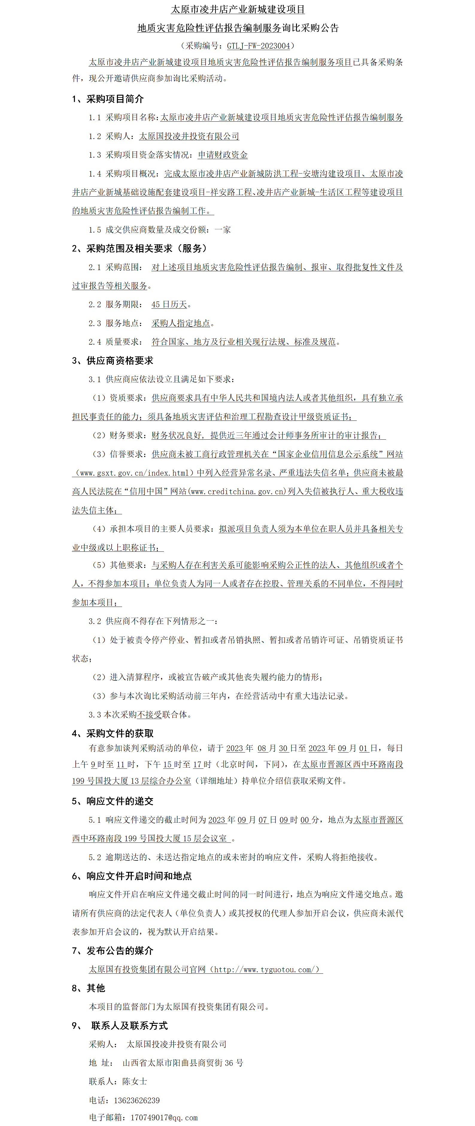 太原市凌井店產業新城建設項目地質災害危險性評估報告編制服務采購項目詢比采購公告