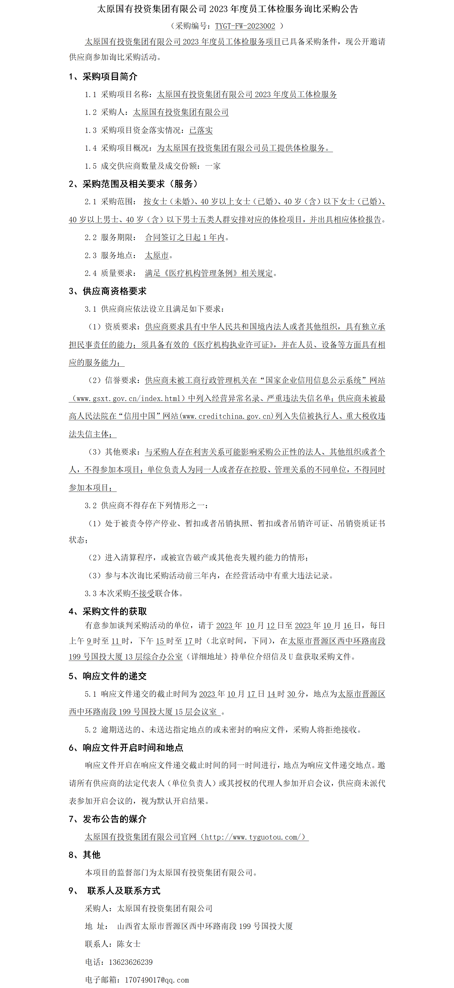 太原國有投資集團有限公司2023年度員工體檢服務項目詢比采購公告