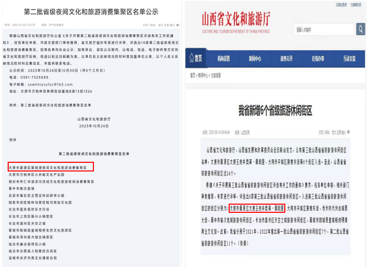 根據山西省文化和旅游廳辦公室《關于開展第二批省級夜間文化和旅游消費集聚區評選有關工作的通知》、《關于開展第三批山西省省級旅游休閑街區評選有關工作的通知》要求,經市級文旅部門審核推薦、省文旅廳組織專家進行評審,我公司申報的《太原市晉源區晉陽湖夜間文化和旅游消費集聚區》、《太原市晉源區太原王府井奧萊?晉陽里》成功獲選。