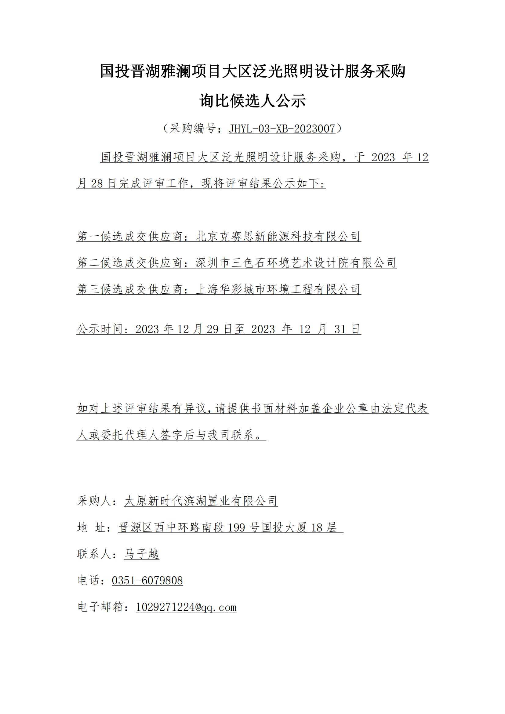 國(guó)投晉湖雅瀾項(xiàng)目大區(qū)泛光照明設(shè)計(jì)服務(wù)采購(gòu)詢(xún)比候選人公示