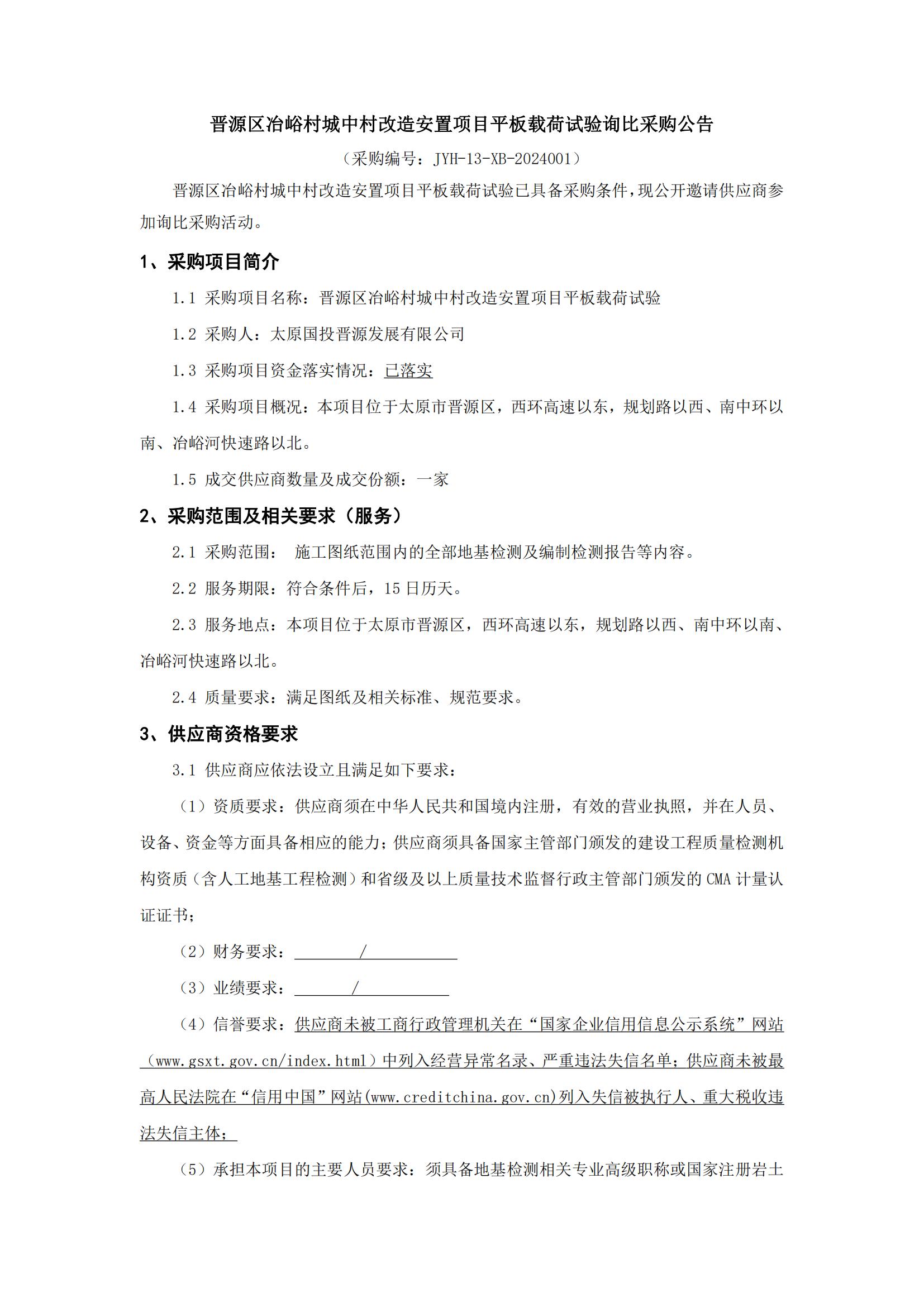 晉源區冶峪村城中村改造安置項目平板載荷試驗詢比采購公告