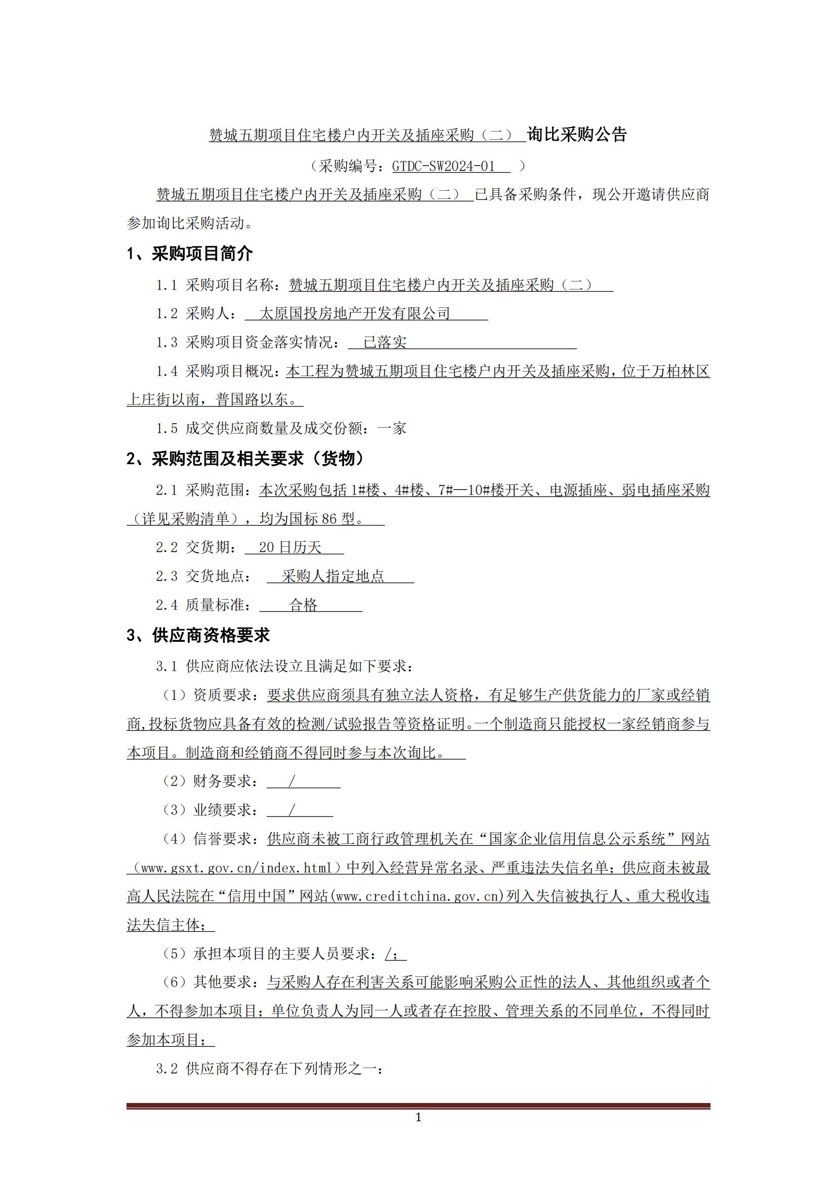 贊城五期項目住宅樓戶內開關機插座采購(二)詢比采購公告