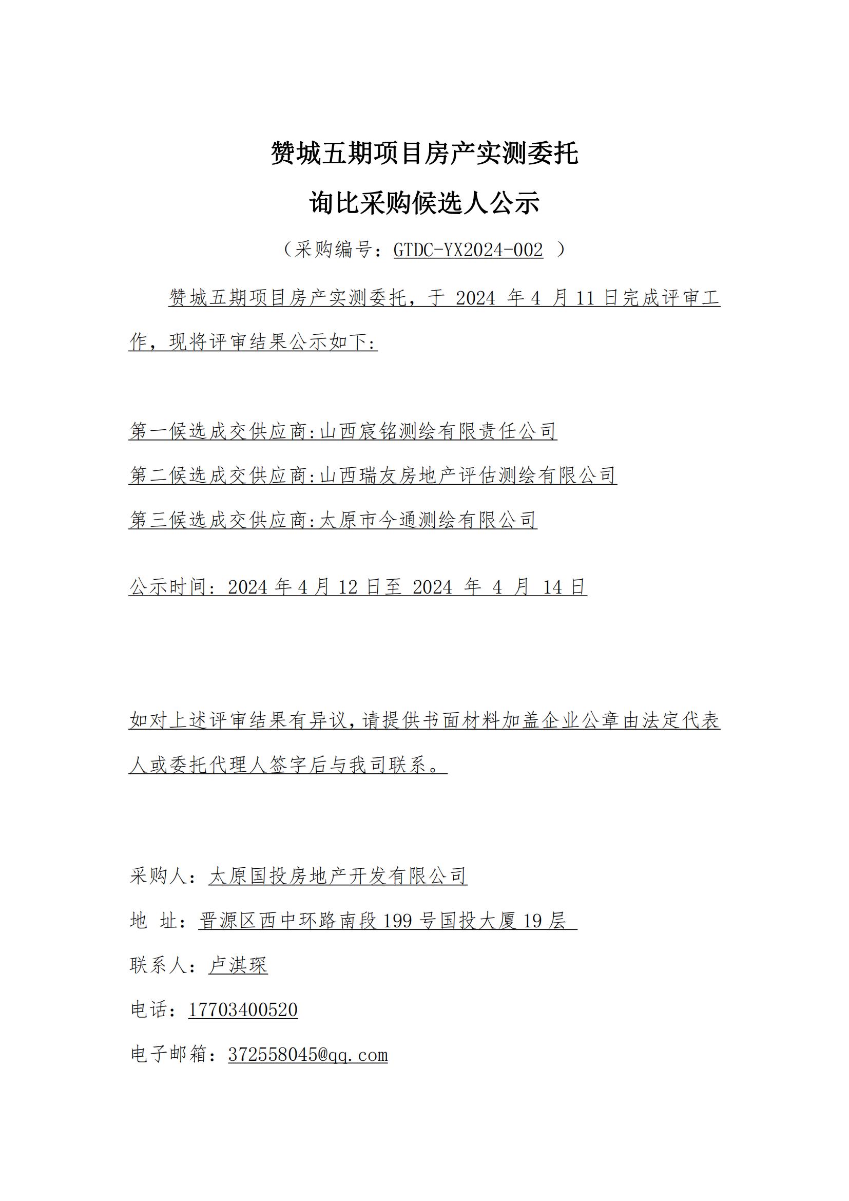 贊城五期項目房產(chǎn)實測委托評估詢比采購候選人公示