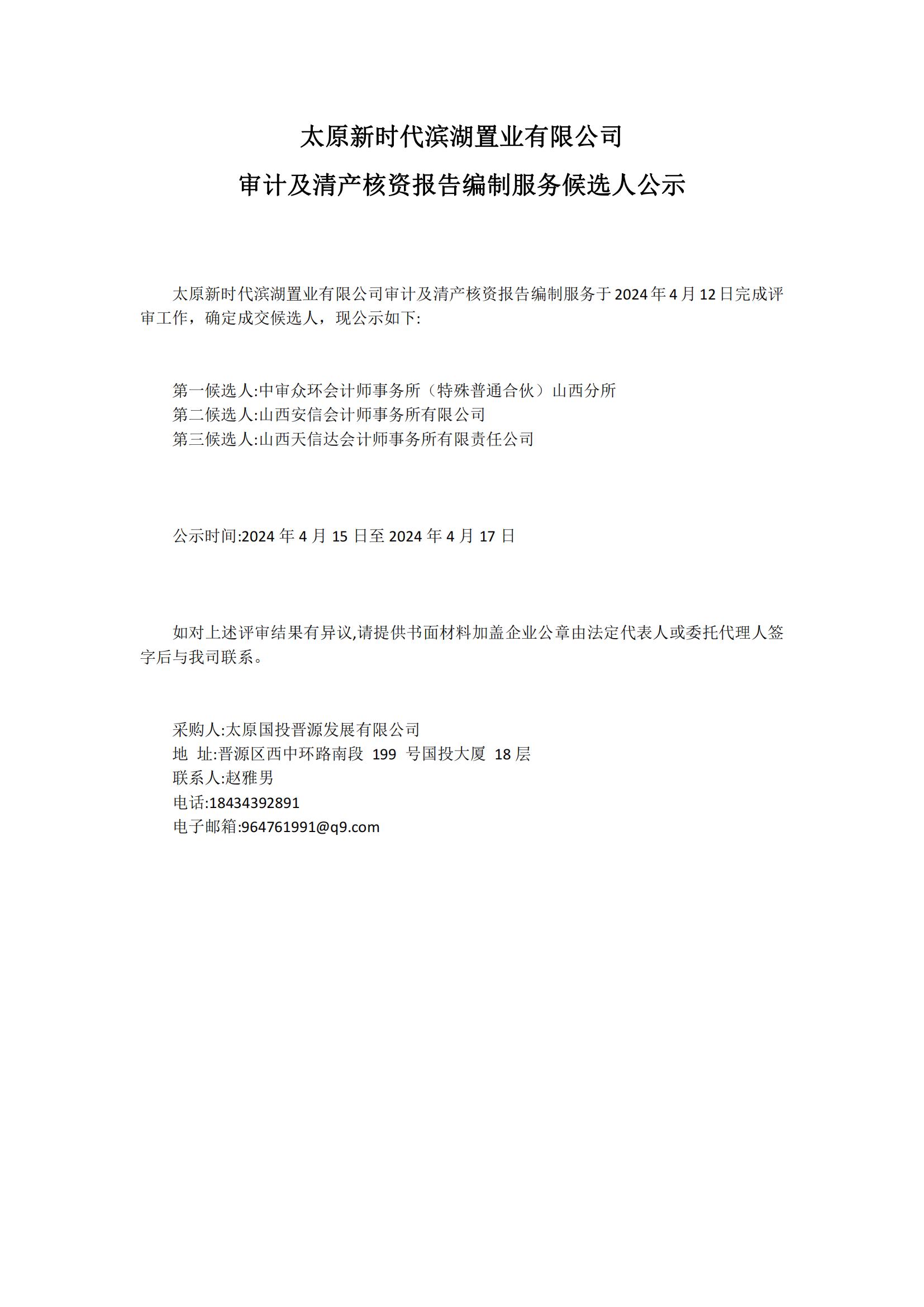 太原新時代濱湖置業(yè)有限公司 審計及清產(chǎn)核資報告編制服務(wù)候選人公示