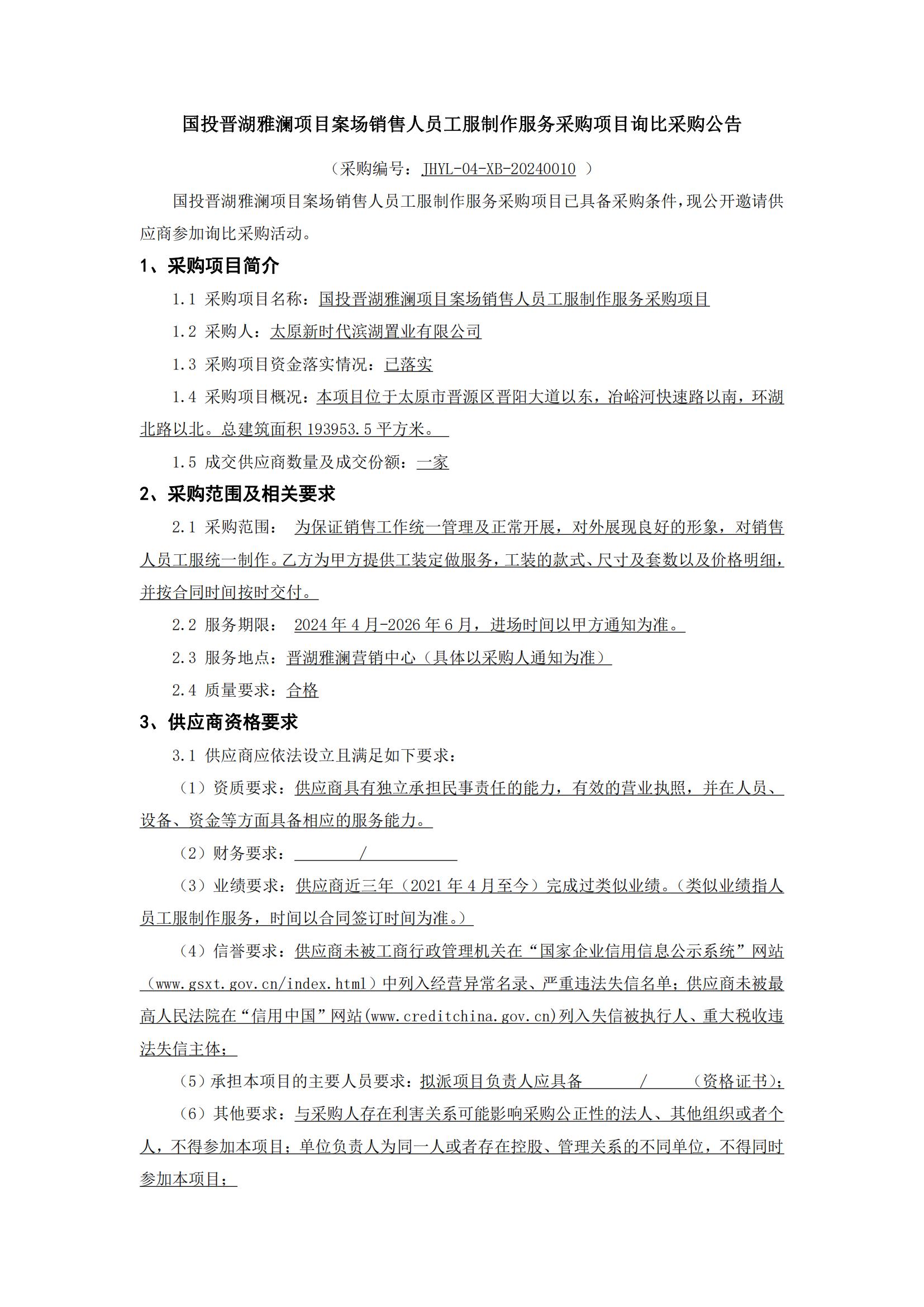 國投晉湖雅瀾項目案場銷售人員工服制作服務采購項目詢比采購公告