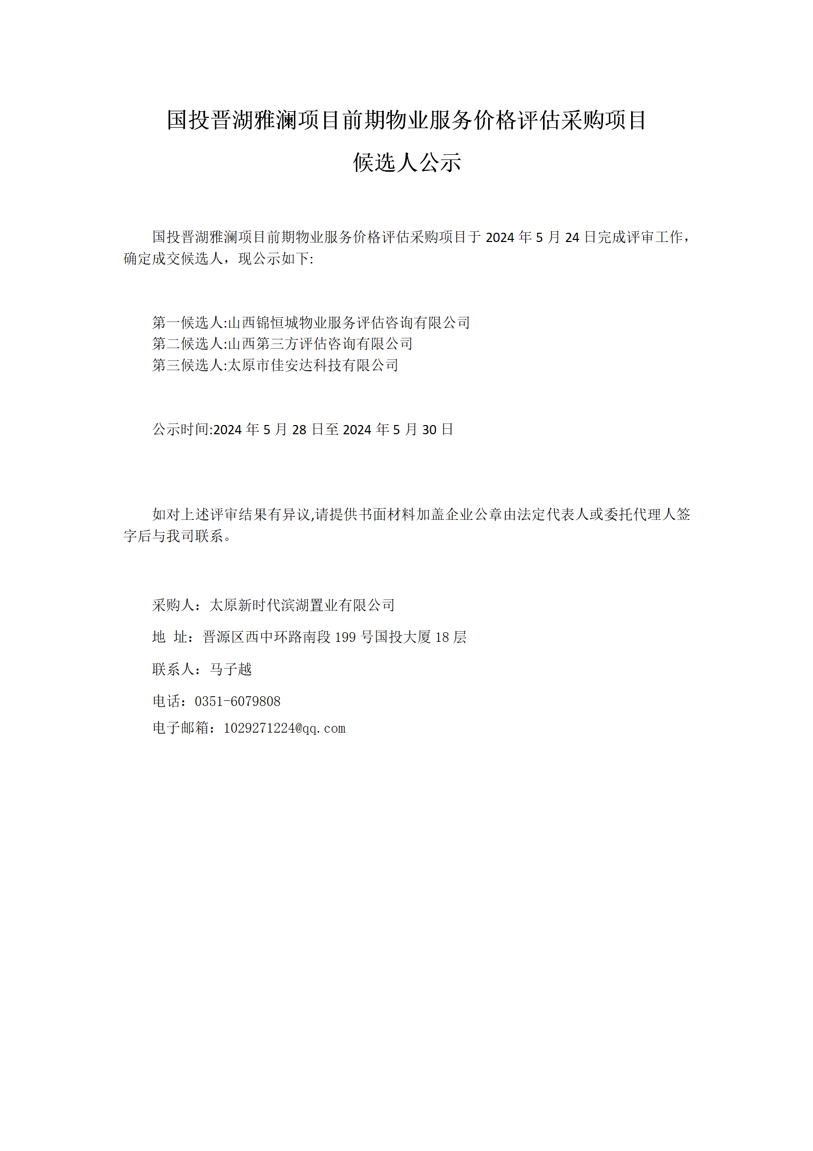 國投晉湖雅瀾項目前期物業服務價格評估采購項目候選人公示