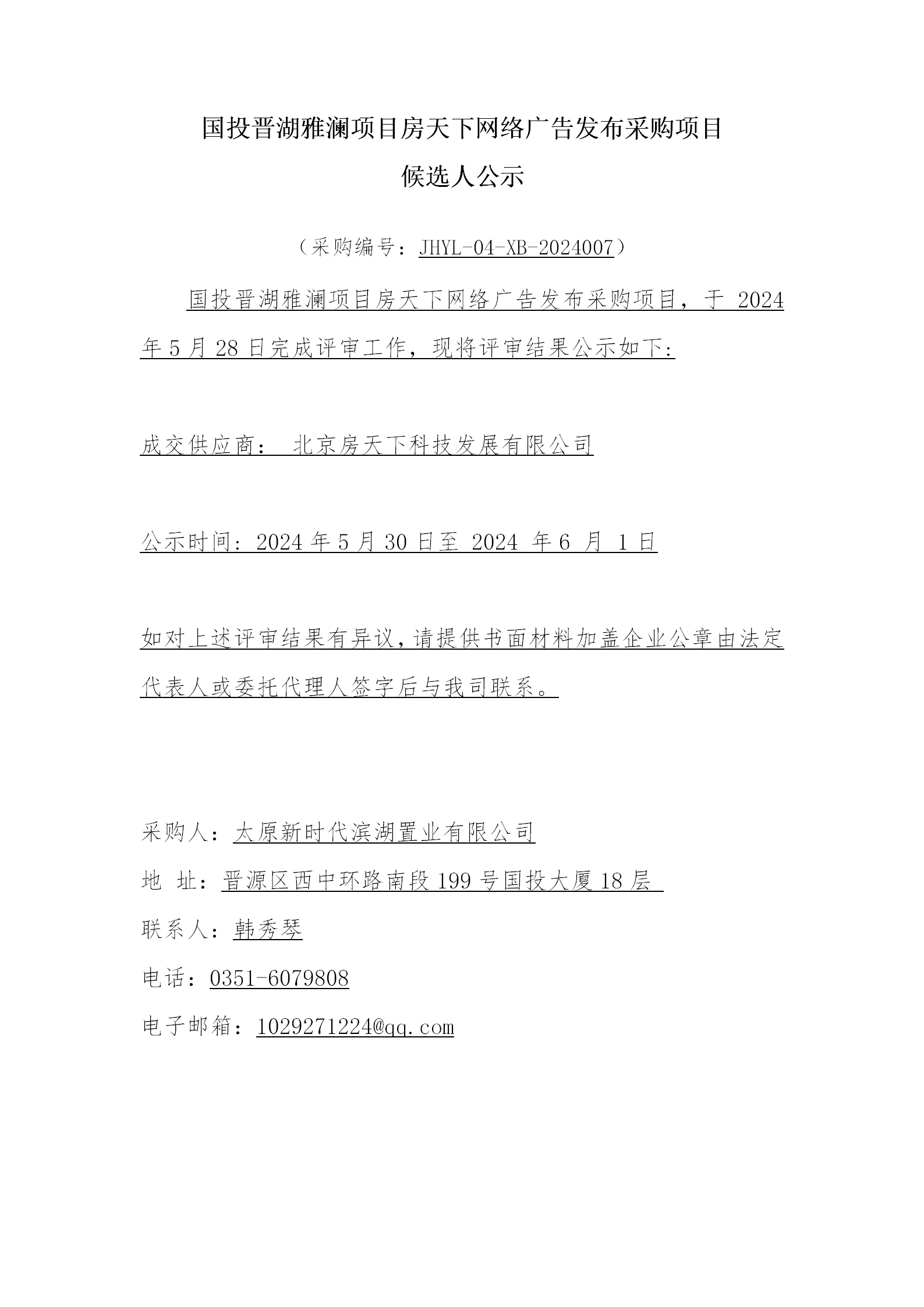 晉湖雅瀾項目房天下網絡廣告發布采購項目候選人公示