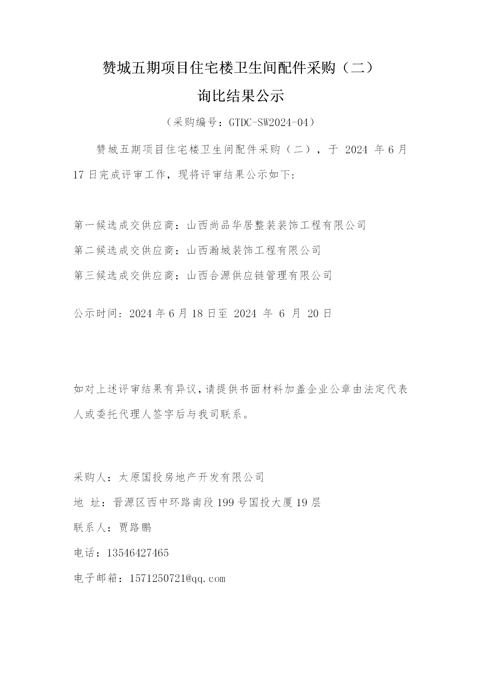 贊城五期項目住宅樓衛生間配件采購(二)詢比候選人公示