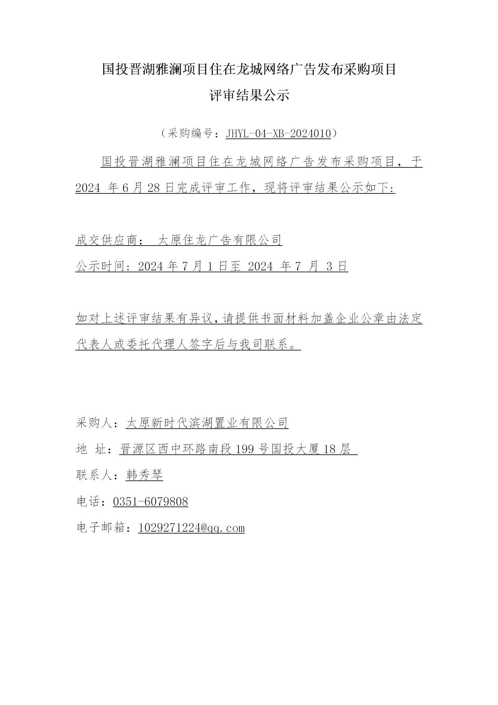 晉湖雅瀾項目住在龍城網絡廣告發布采購項目評審結果公示