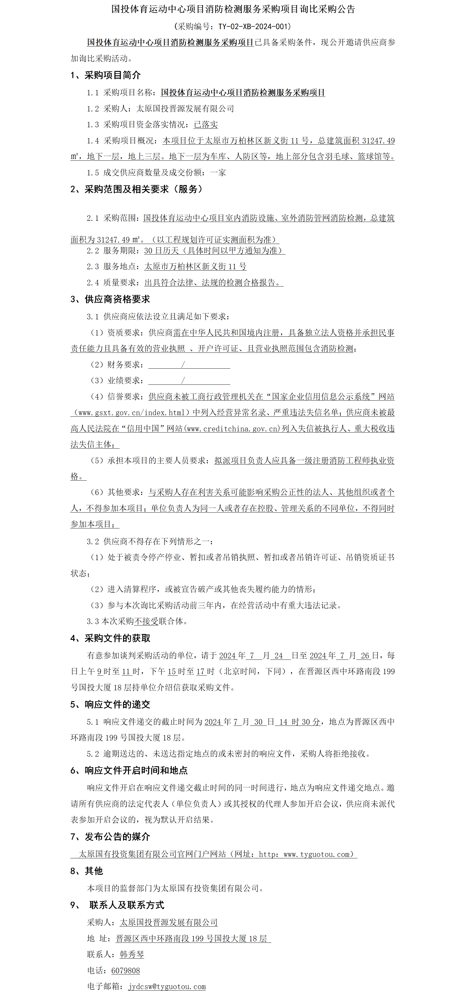 國投體育運動中心項目消防檢測服務采購項目詢比采購公告
