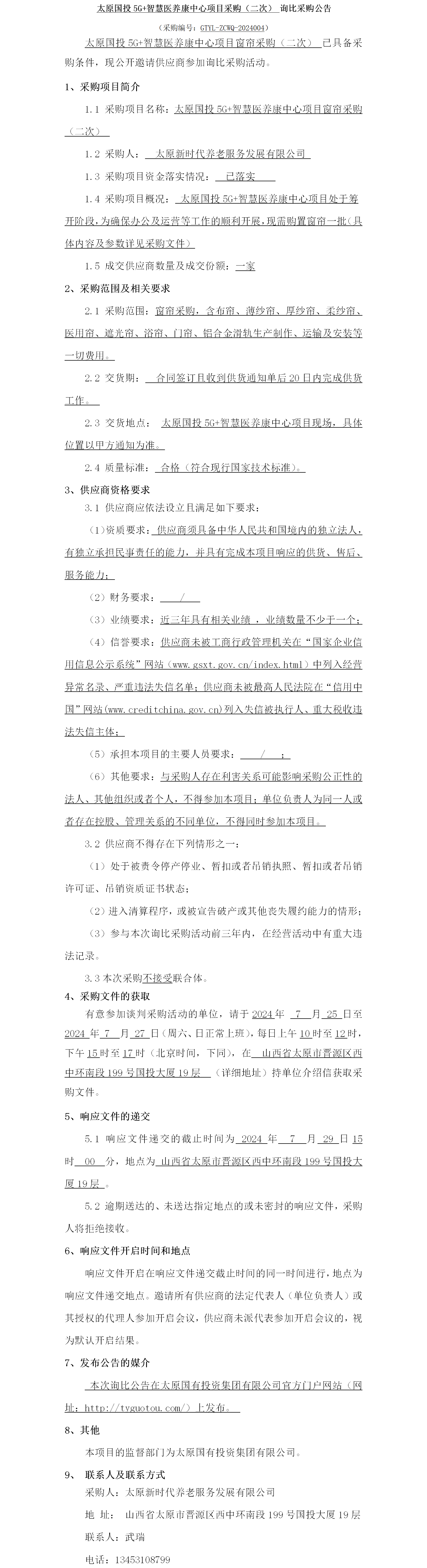 太原國投5G+智慧醫養康中心項目采購(二次)詢比采購公告
