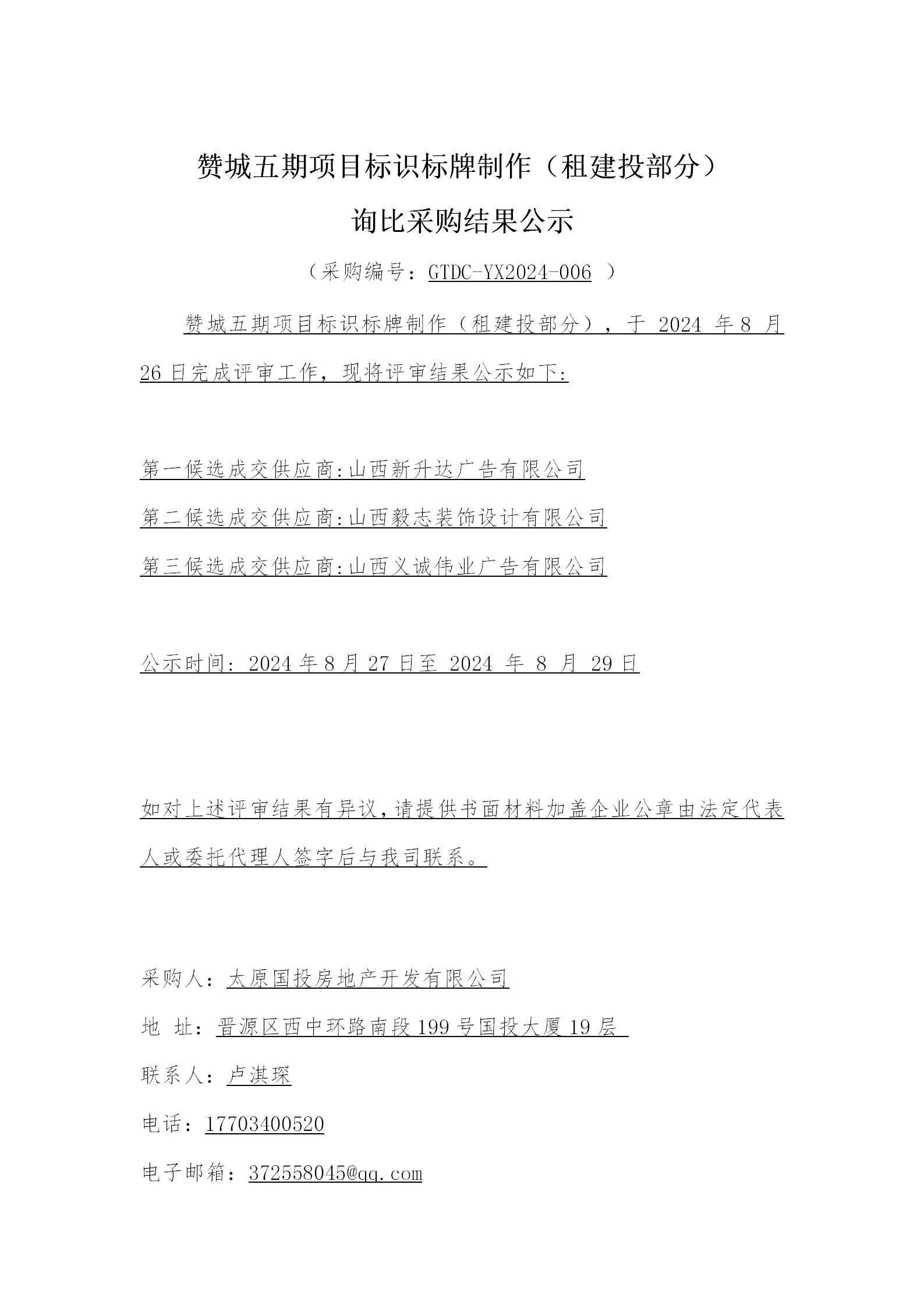 贊城五期項目標識標牌制作(租建投部分)詢比采購結果公示