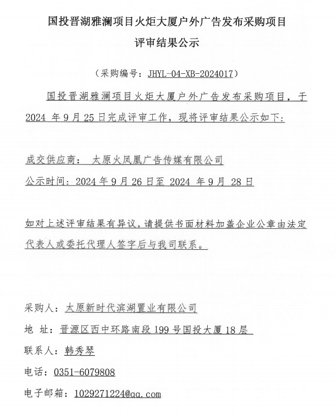 國(guó)投晉湖雅瀾項(xiàng)目火炬大廈戶外廣告發(fā)布采購(gòu)項(xiàng)目評(píng)審結(jié)果公示