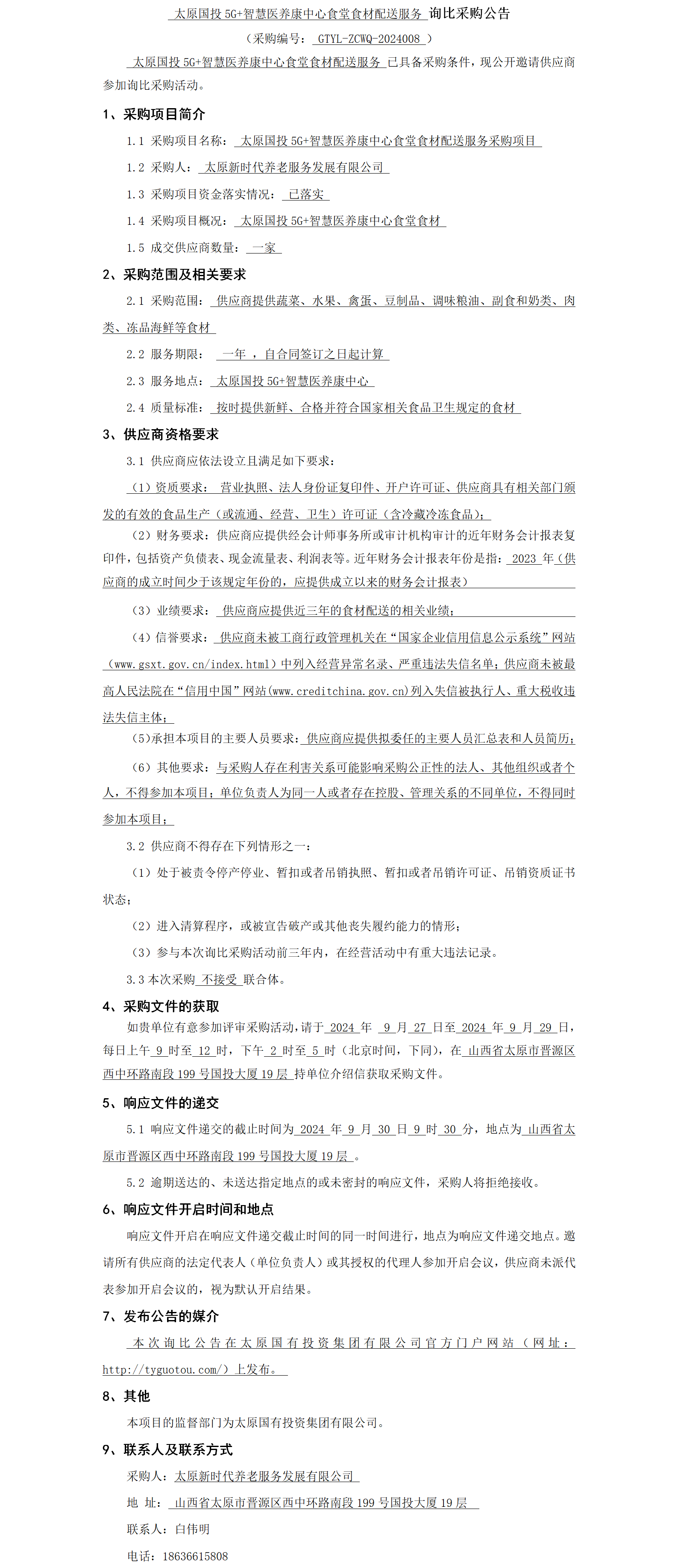 太原國投5G+智慧醫(yī)養(yǎng)康中心食堂食材配送服務(wù)詢比采購公告
