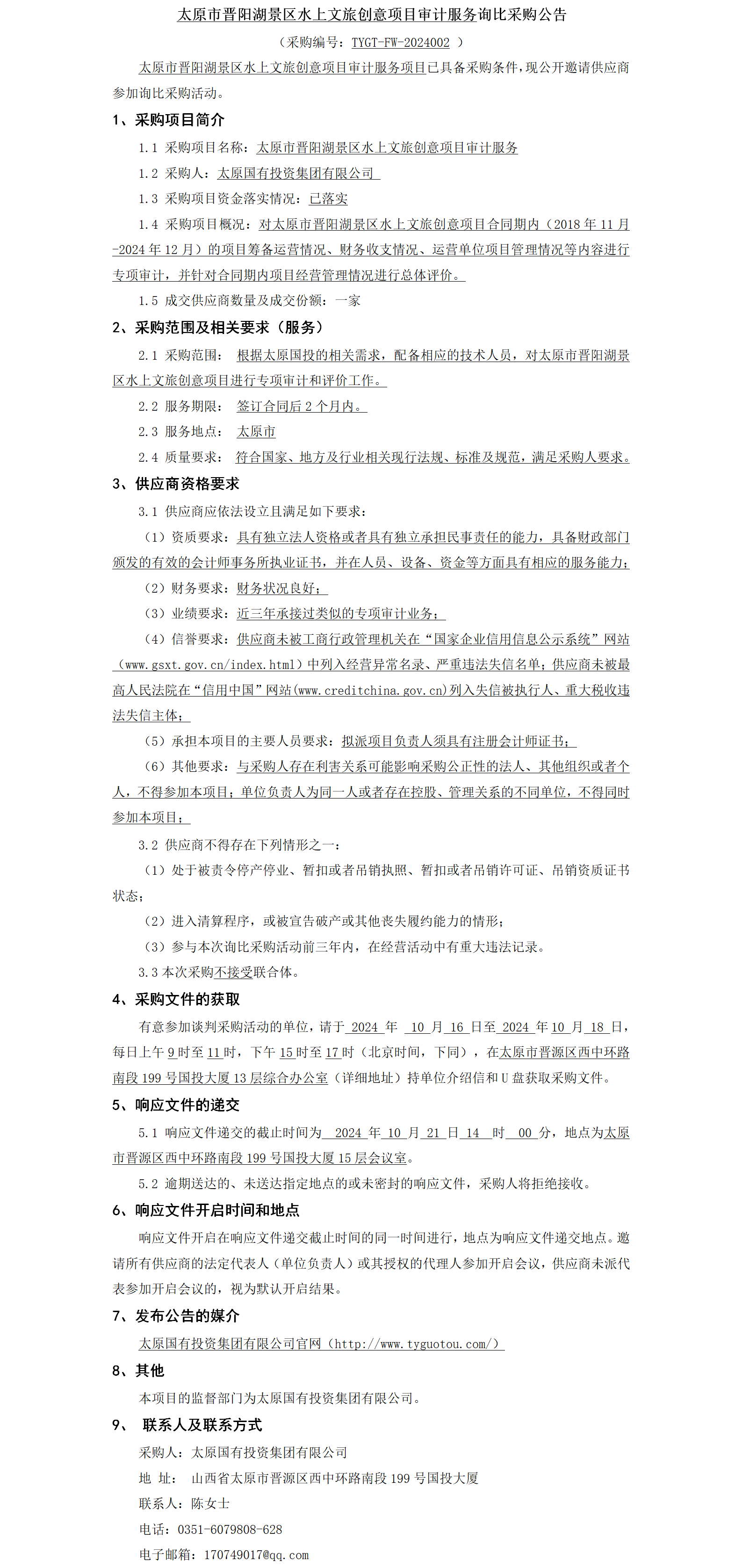 太原市晉陽湖景區水上文旅創意項目審計服務詢比采購公告