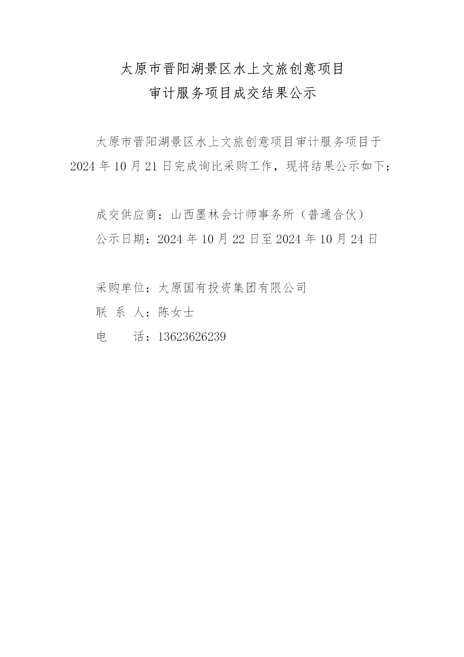 太原市晉陽湖景區水上文旅創意項目審計服務詢比成交結果公示