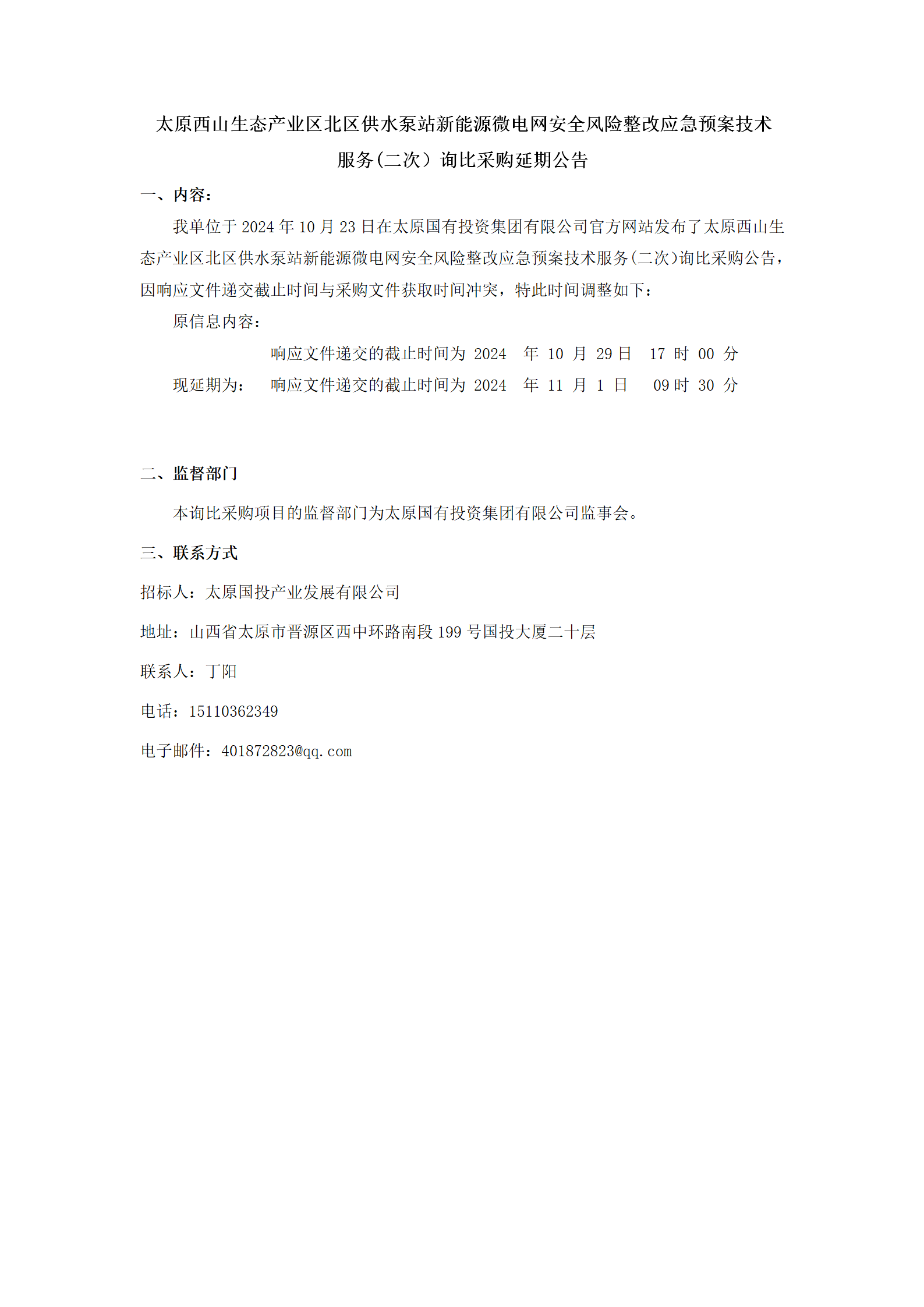 太原西山生態產業區北區供水泵站新能源微電網安全風險整改應急預案技術服務(二次)詢比采購延期公告